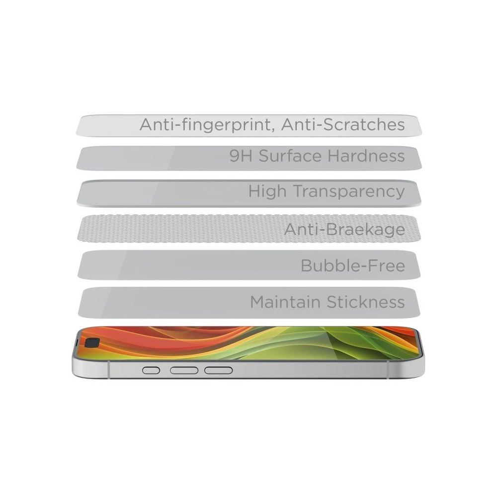 - Изработен от първокласно алуминосиликатно стъкло, този протектор предлага превъзходна твърдост и устойчивост на удар, гарантирайки, че вашият iPhone ще остане защитен от ежедневни драскотини, изпускания и удари