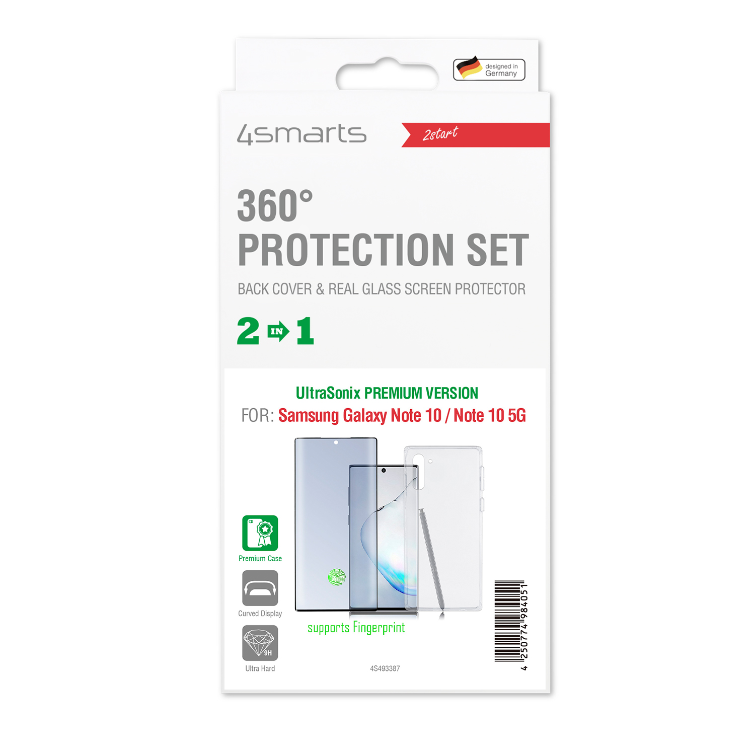 4smarts 360° Premium Protection Set UltraSonix - тънък силиконов кейс и стъклено защитно покритие за дисплея на Samusg Galaxy Note 10, Note 10 5G (прозрачен)