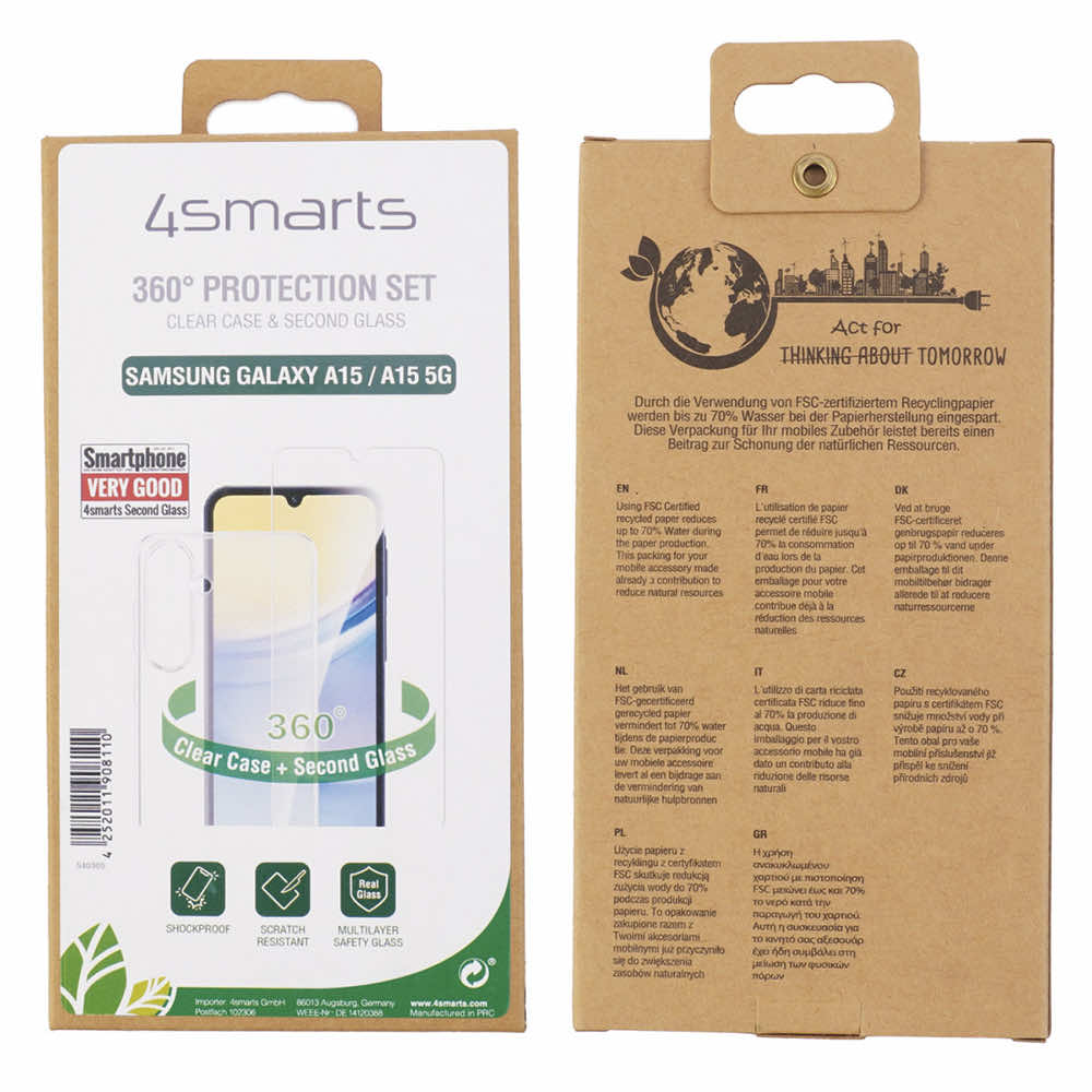 4smarts 360° Starter Set - тънък силиконов кейс и стъклено защитно покритие за дисплея на Samsung Galaxy A15, A15 5G (прозрачен)