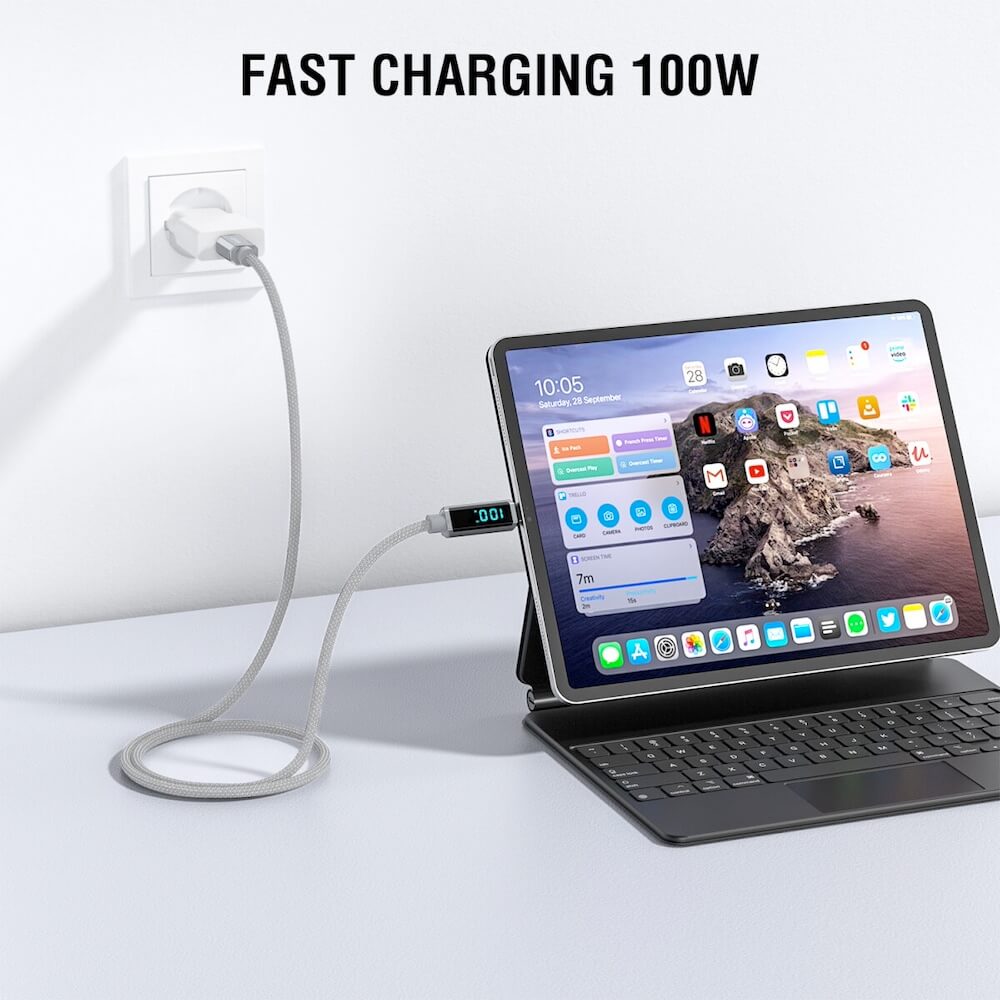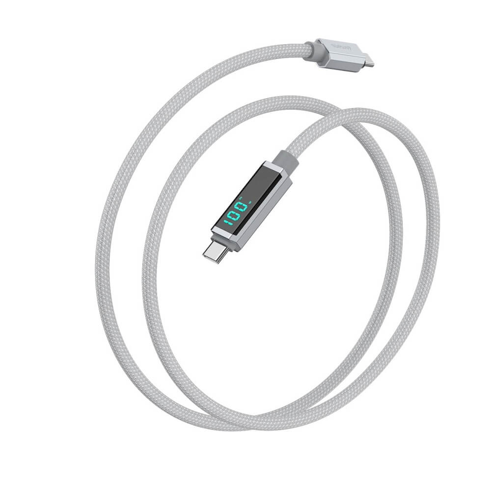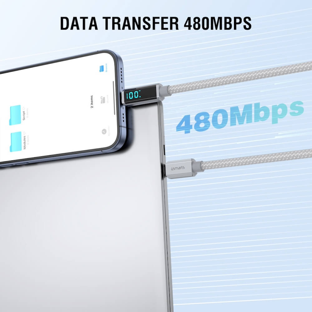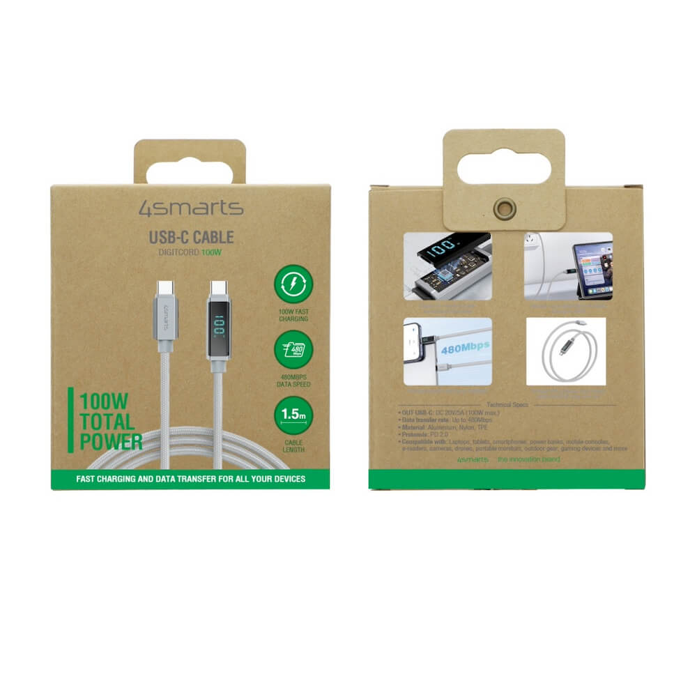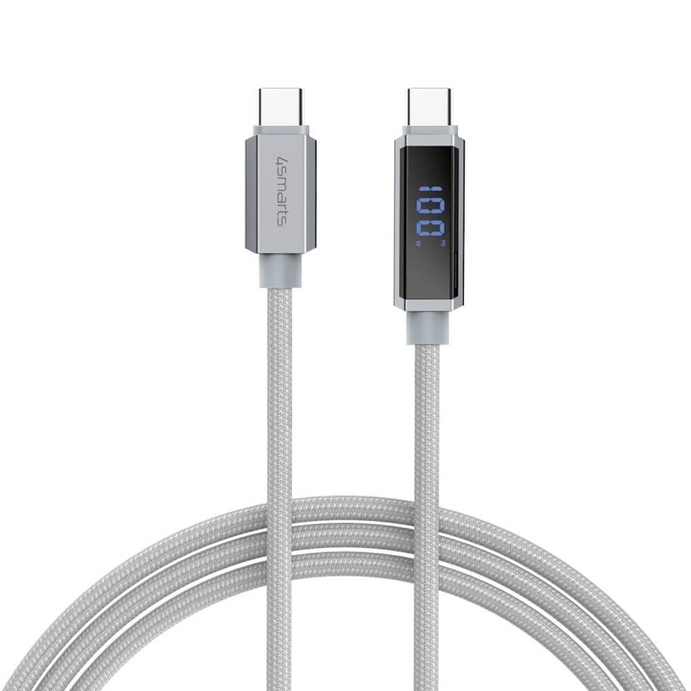 4smarts DigitCord USB-C to USB-C 100W Cable - здрав кабел с въжена оплетка и дисплей, за зареждане на устройства с USB-C порт (150 см) (сив)