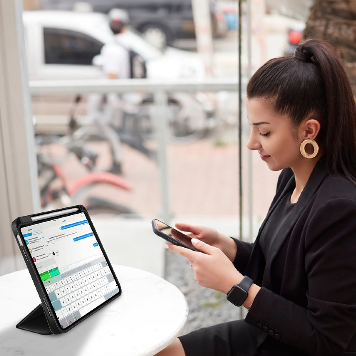 - Специално отделение за Apple Pencil, позволяващо удобно съхранение без изваждане на таблета.