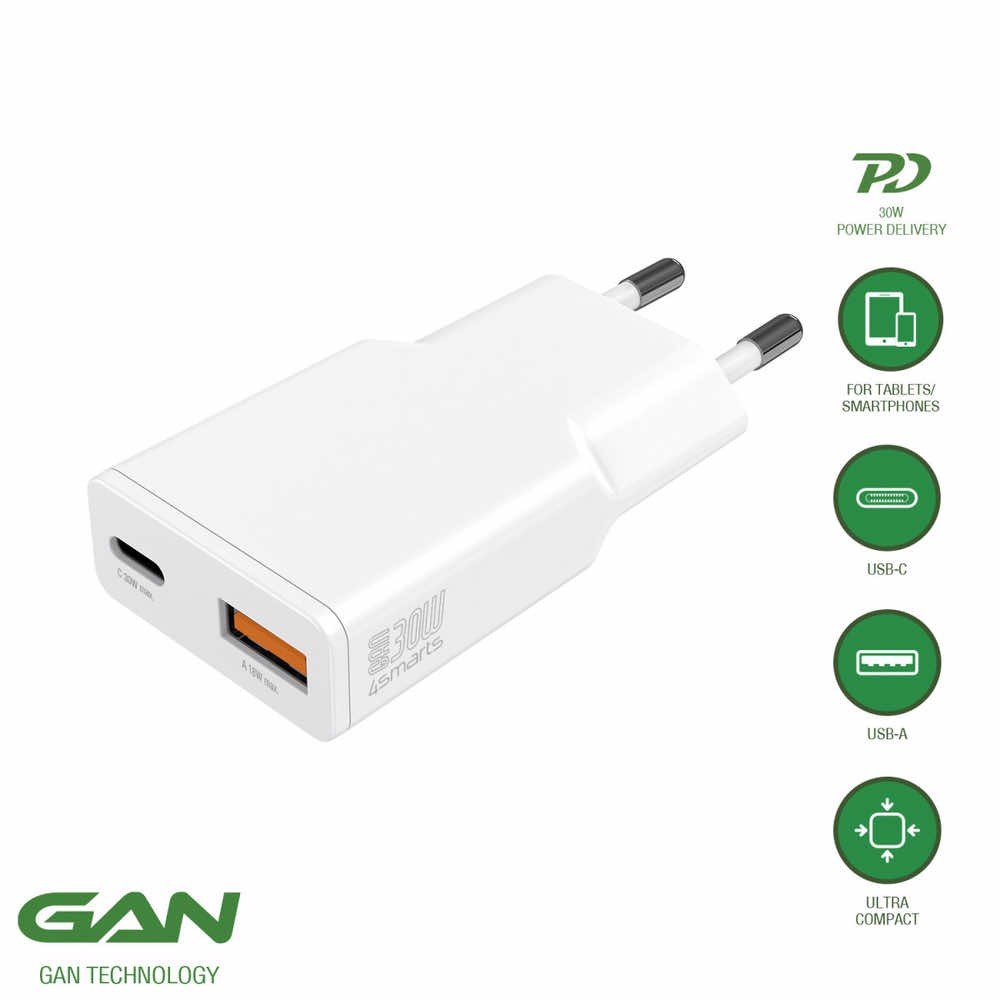 4smarts GaN Duos Slim Wall Charger 30W PD - захранване за ел. мрежа с USB-A и USB-C изходи и технология за бързо зареждане (бял)
