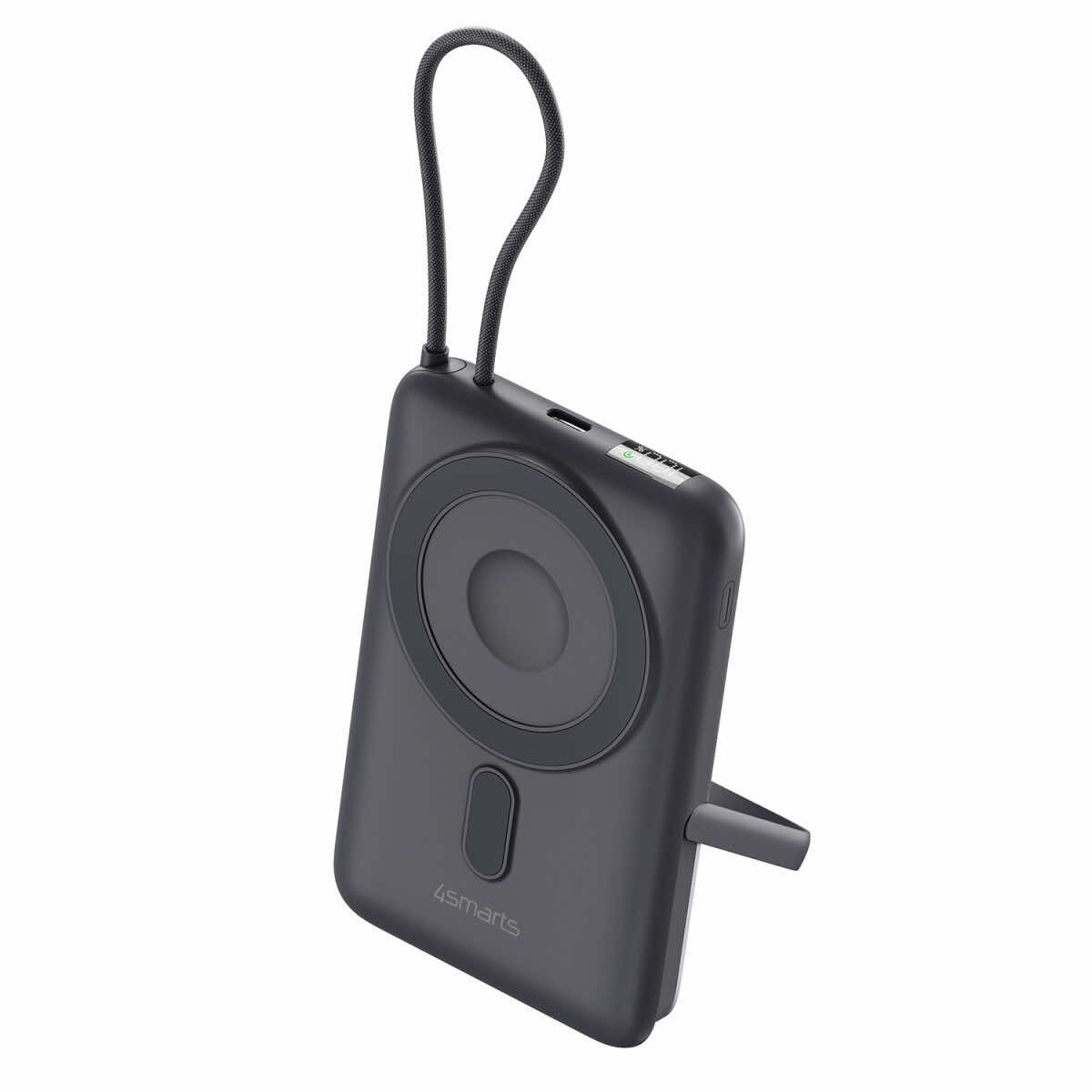 4smarts Power Bank Enterprise Pocket 10000 mAh 22.5W Qi2 - външна батерия с вграден USB-C кабел, USB-C порт и Qi2 безжично зареждане (тъмносив)