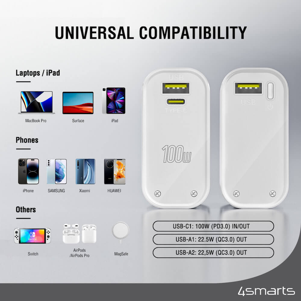 4smarts Power Bank Lucid Block 20000 mAh 100W - външна батерия с 2xUSB-A и 1xUSB-C портове с технология за бързо зареждане (бял)