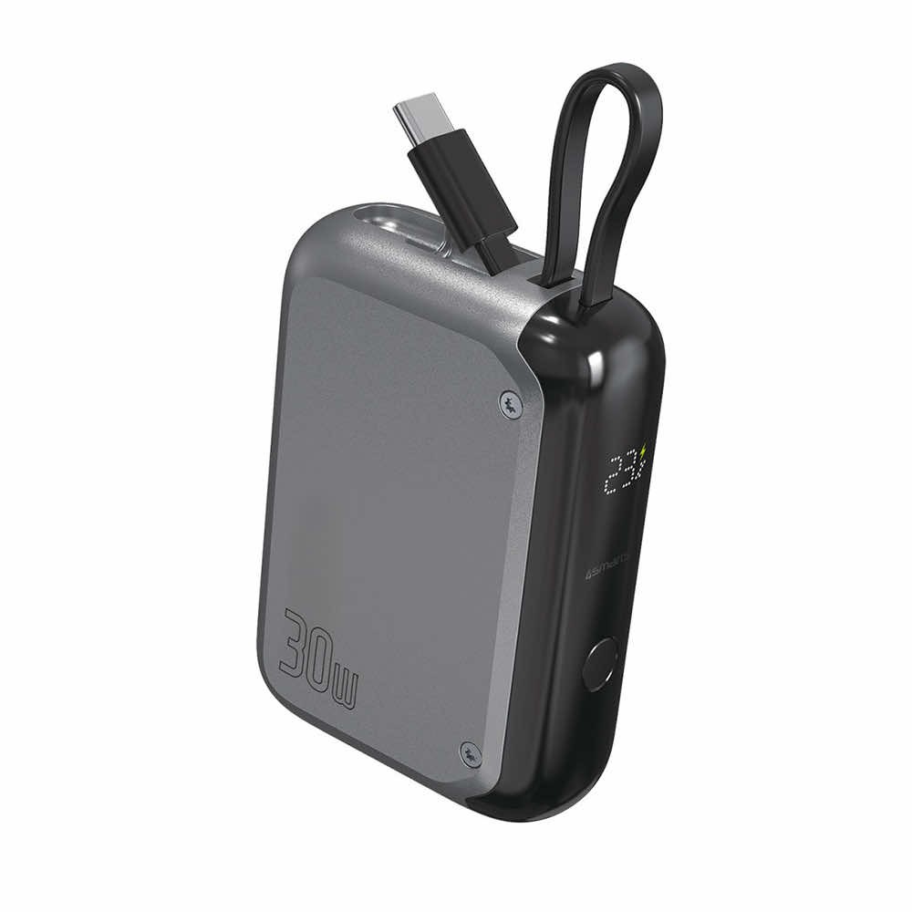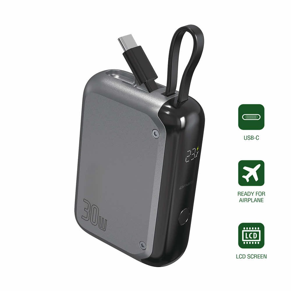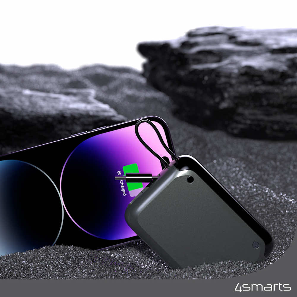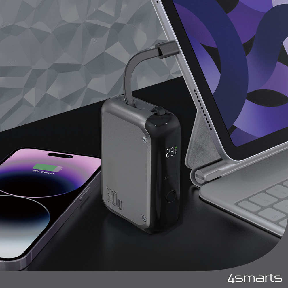 4smarts Power Bank Pocket 10000 mAh 30W - външна батерия с вграден USB-C кабел и USB-C изход с технология за бързо зареждане (сив)