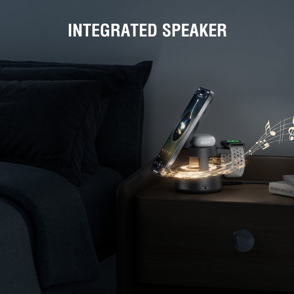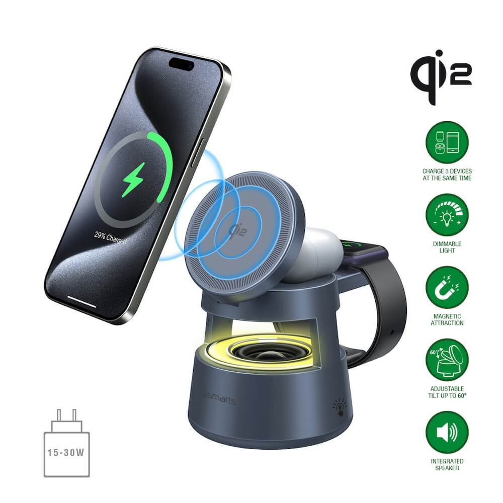 4smarts Qi2 Aura Sound 3-в-1 Зарядна Станция с Bluetooth Спийкър