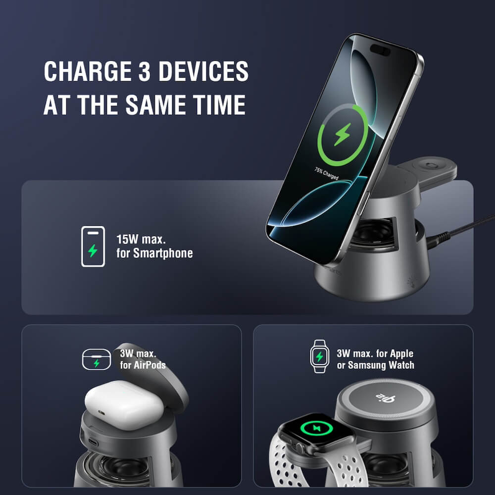 4smarts Qi2 Aura Sound 3-in-1 Charging Station With Bluetooth Speaker - безжичен спийкър с тройна поставка (пад) за безжично зареждане за iPhone с Magsafe и AirPods (тъмносив)