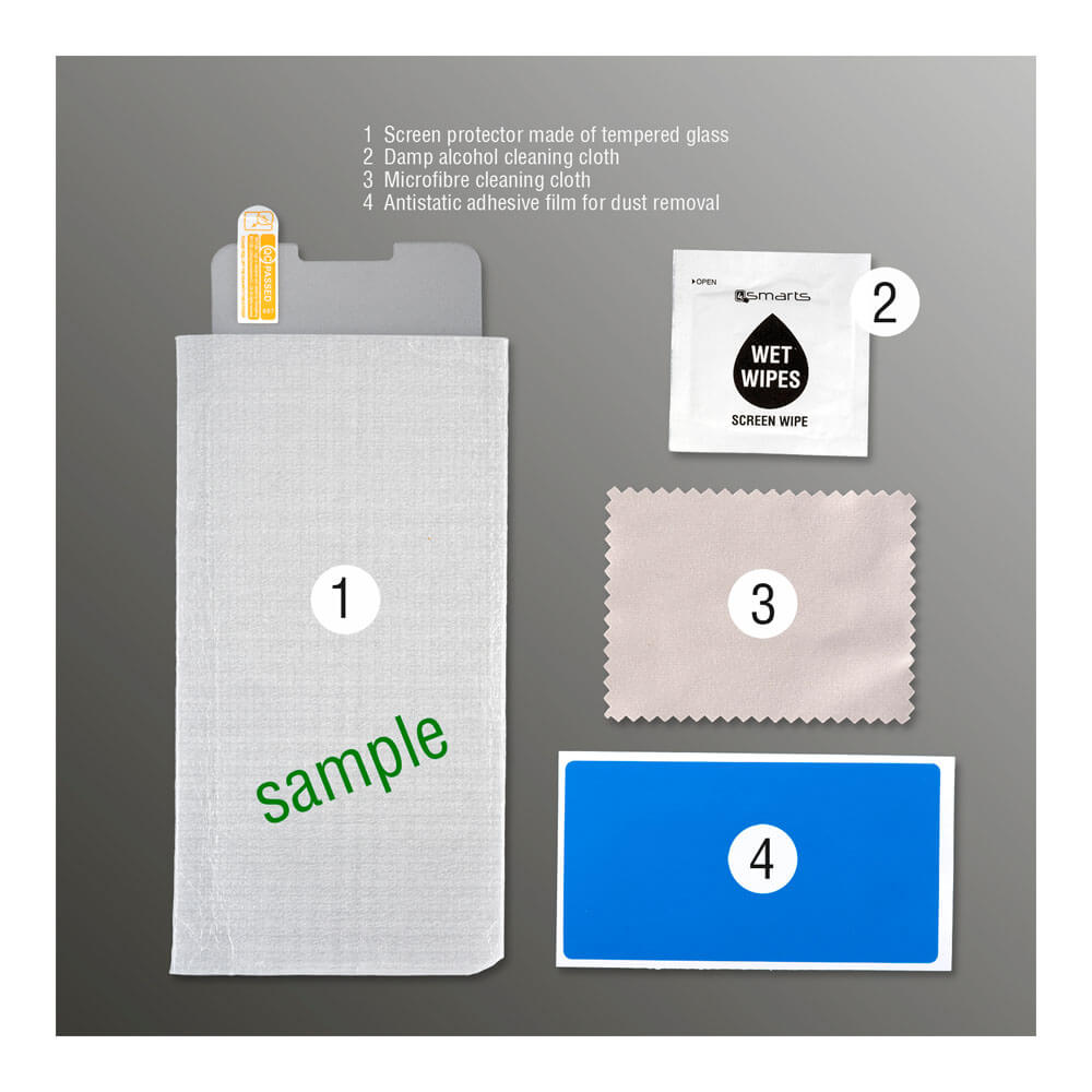 - 1 х 4smart Tempered Glass Protector - 1 x микрофибърна кърпичка - 1 х мокра кърпичка - 1 х антистатична лепенка за премахване на прашинки