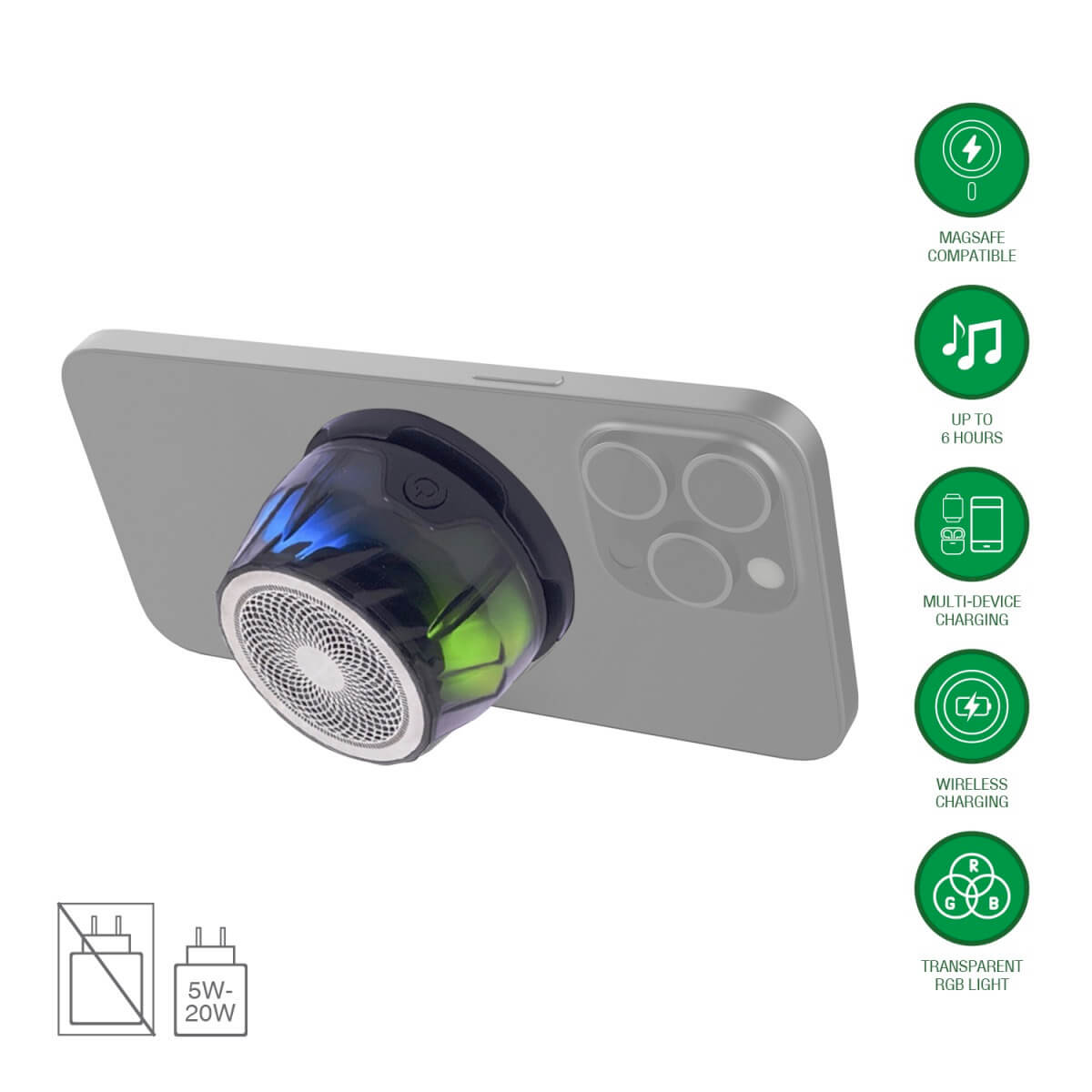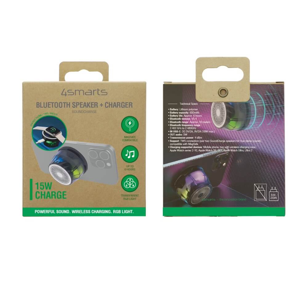 4smarts SoundCharge MagSafe Bluetooth Speaker 5W - портативен безжичен блутут спийкър с MagSafe и поставка (пад) за безжично зареждане за iPhone и мобилни устройства (черен-прозрачен)