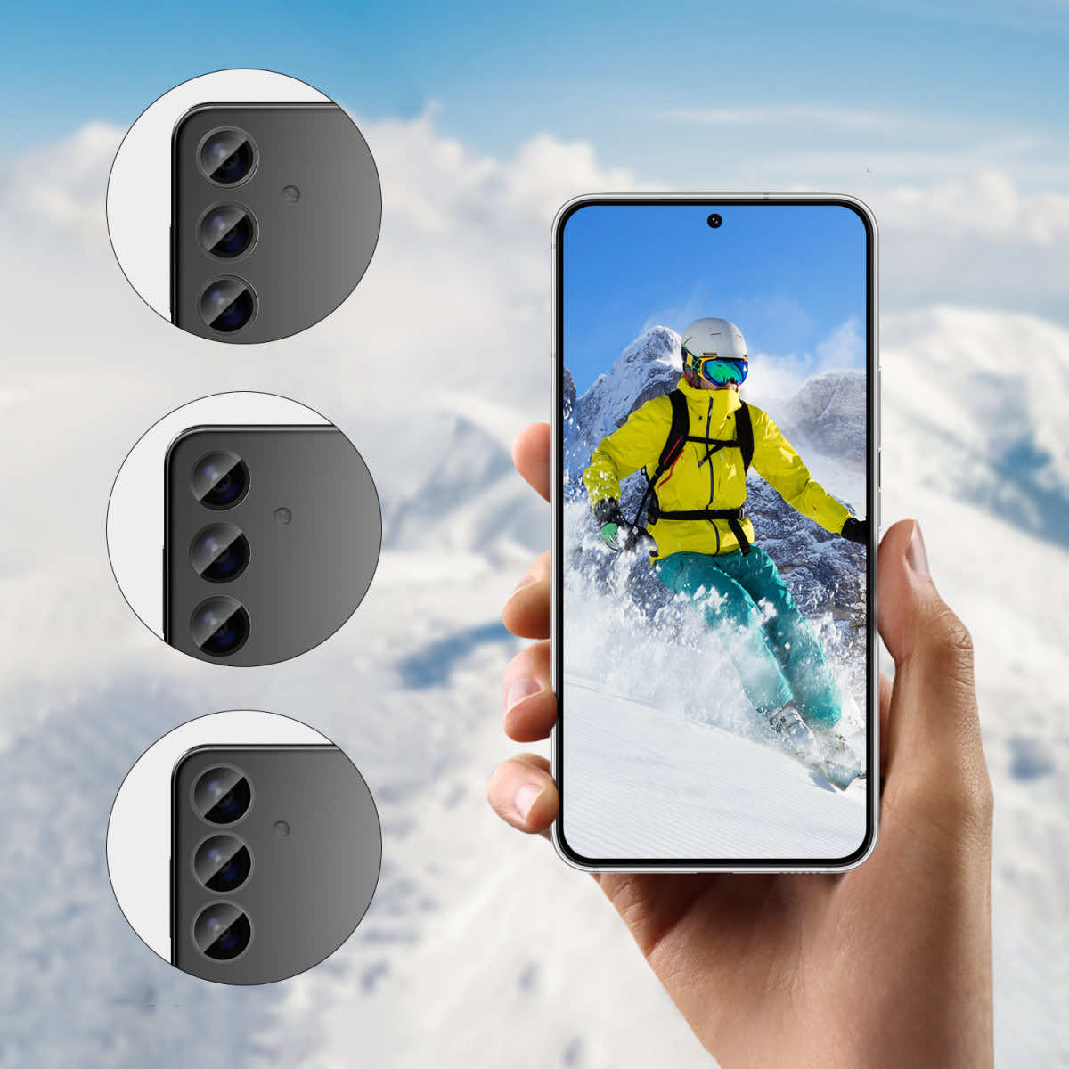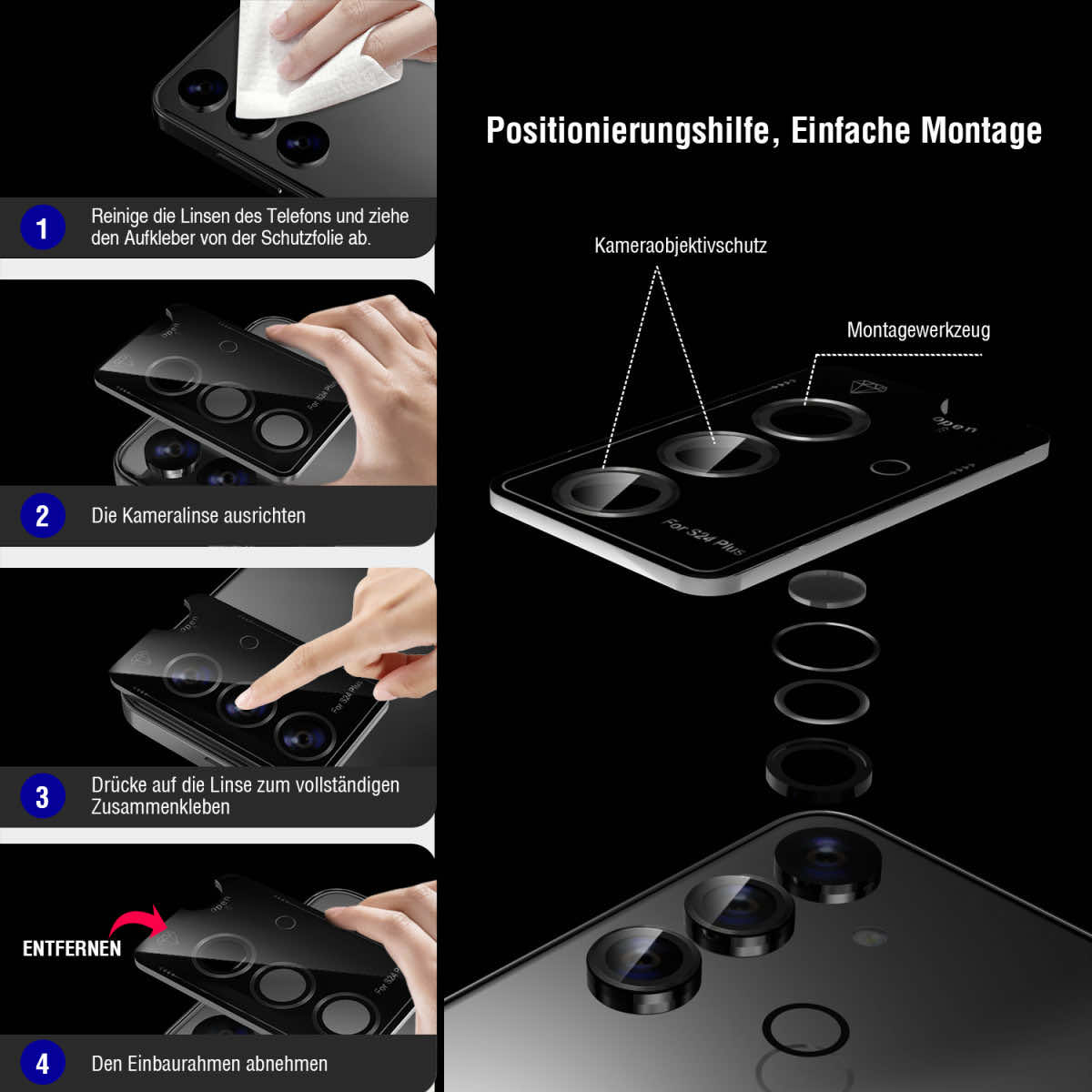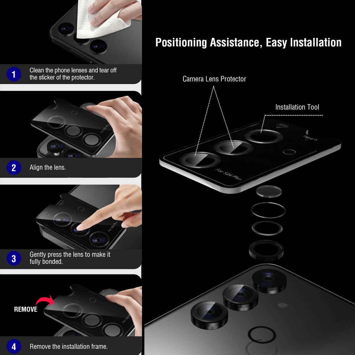 - • Четири комплекта качествени стъклени покрития за камерата на Galaxy S24 Plus
