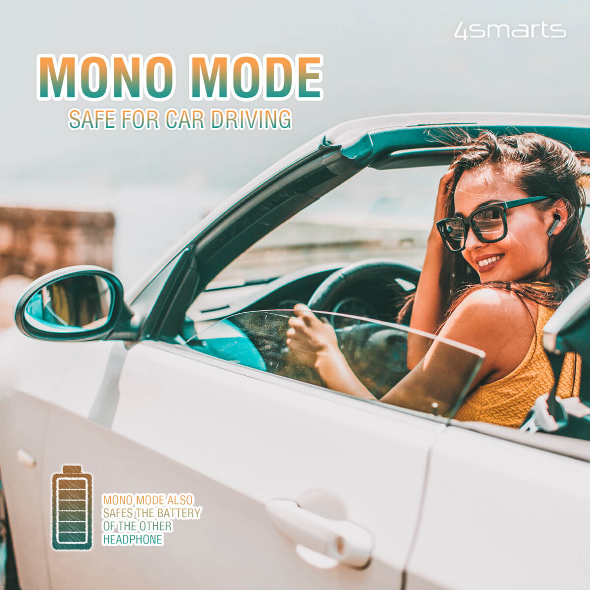 - Режим моно - благодарение на вграденият микрофон във всяка слушалка, вие може да използвата 4smarts TWS Twin Eara и като спийкър във вашата кола