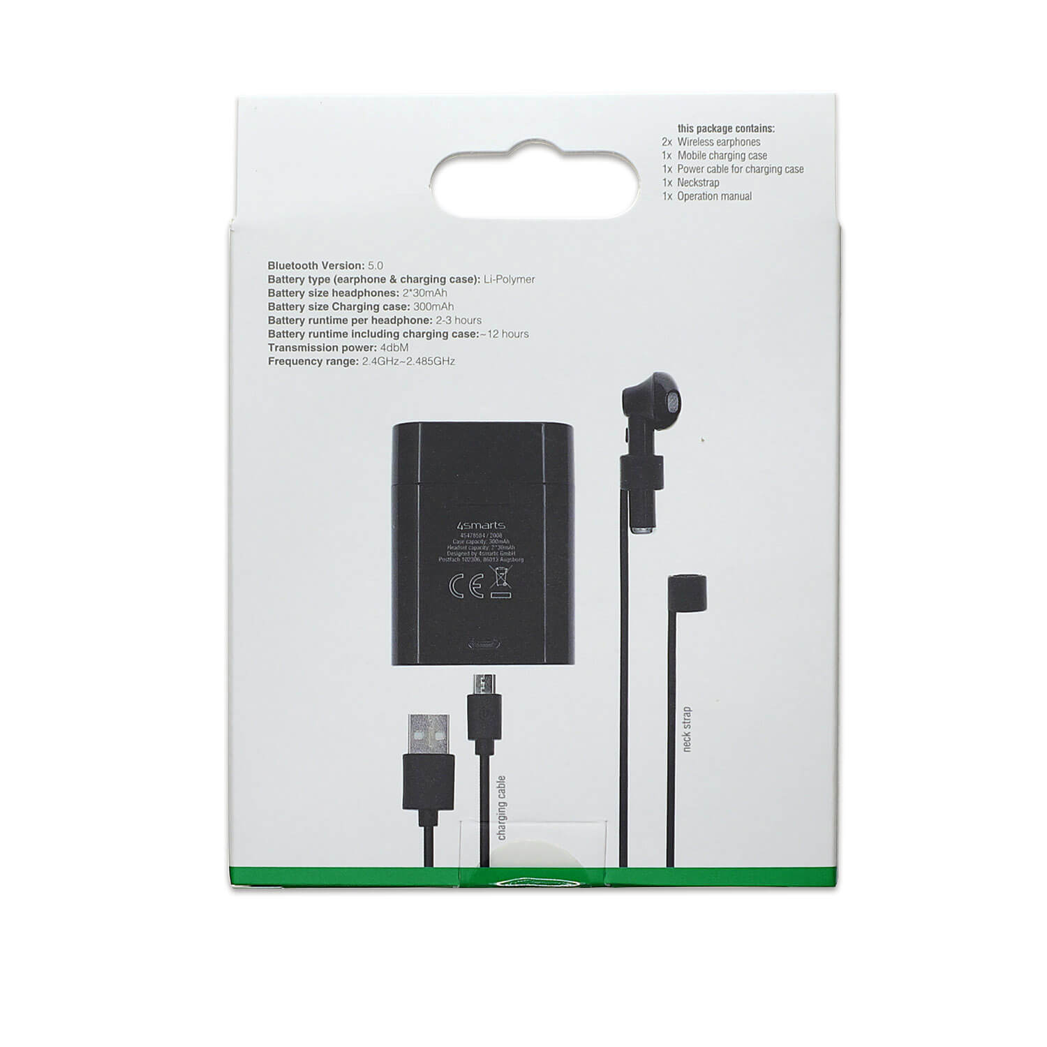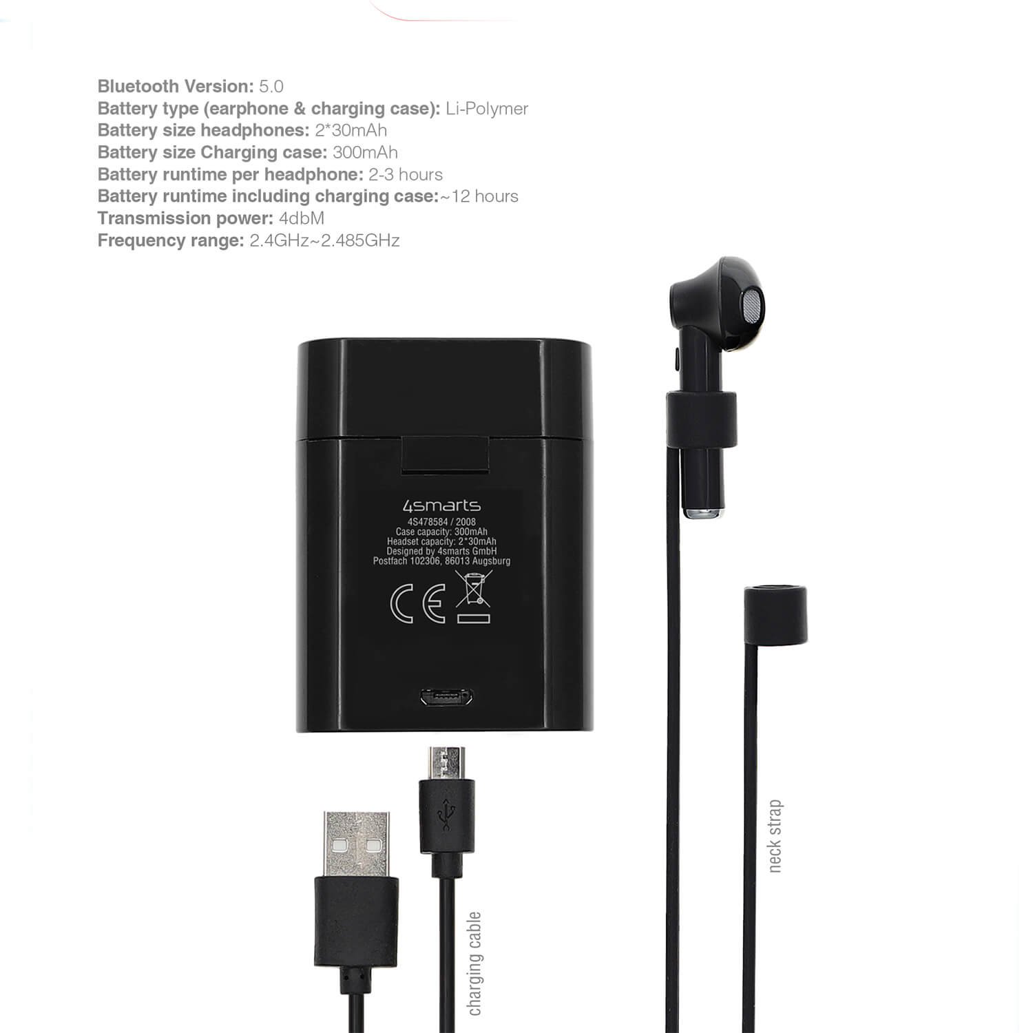 - 4smarts Wireless Headphones Eara TWS 3 - Кейс за зареждане на слушалките - Кабел за зареждане на кейса - Лента за врата