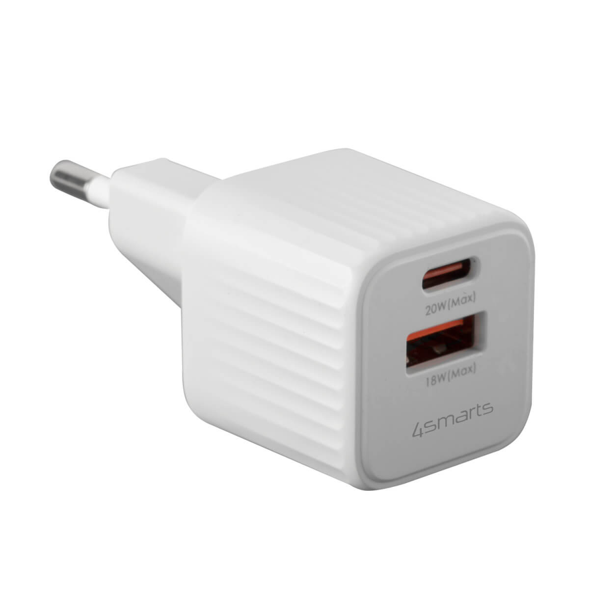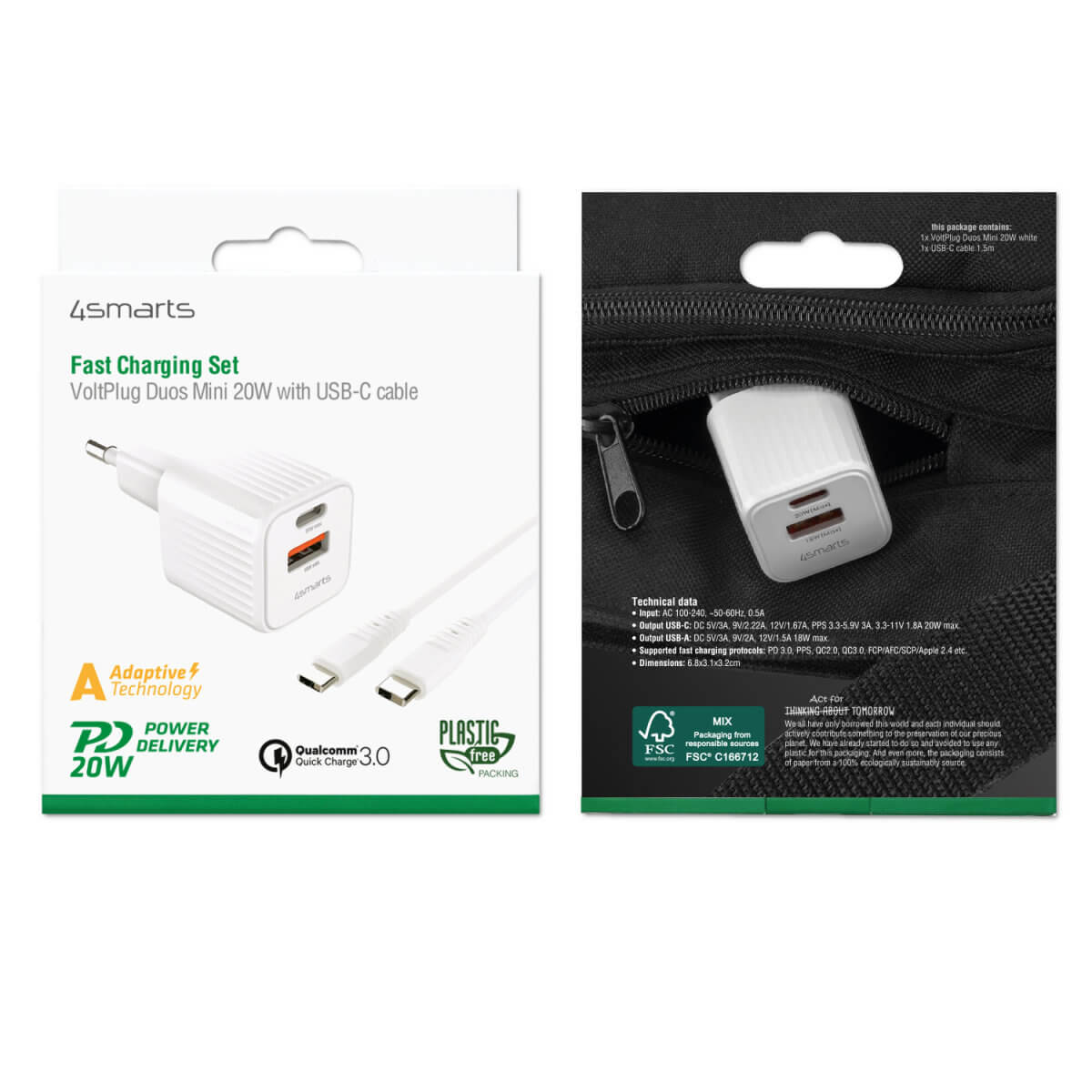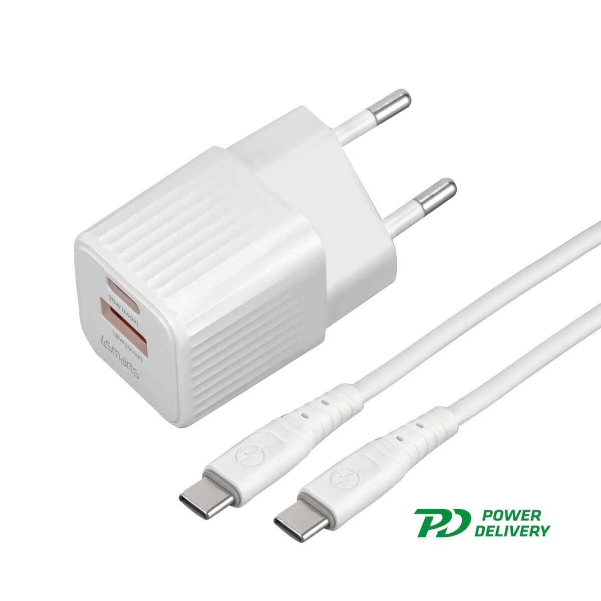 4smarts Wall Charger VoltPlug Duos Mini PD 20W and USB-C Cable - захранване за ел. мрежа с USB-A и USB-C изходи с технология за бързо зареждане и USB-C към USB-C кабел (150 см) (бял)