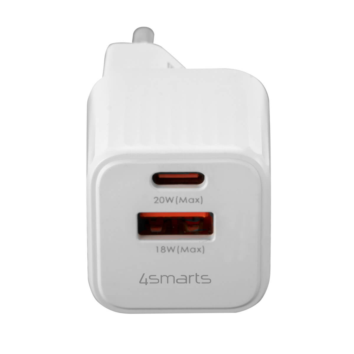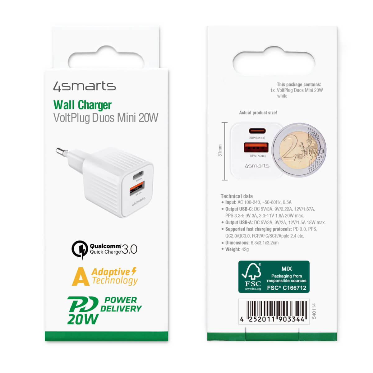 4smarts Wall Charger VoltPlug Duos Mini PD 20W - захранване за ел. мрежа с USB-A и USB-C изходи и технология за бързо зареждане (бял)