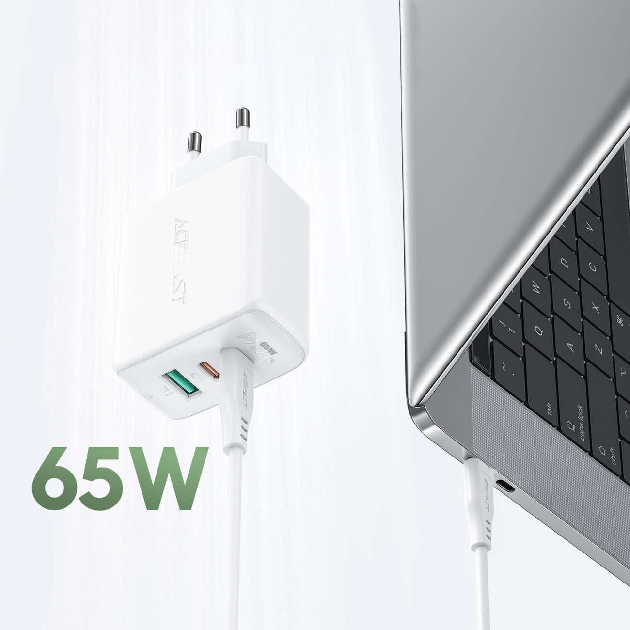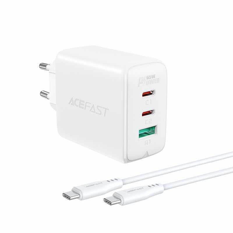 Acefast A13 PD 65W Charger - захранване за ел. мрежа за лаптопи, смартфони и таблети с 2XUSB-C и USB-A изходи и USB-C към USB-C кабел (бял)