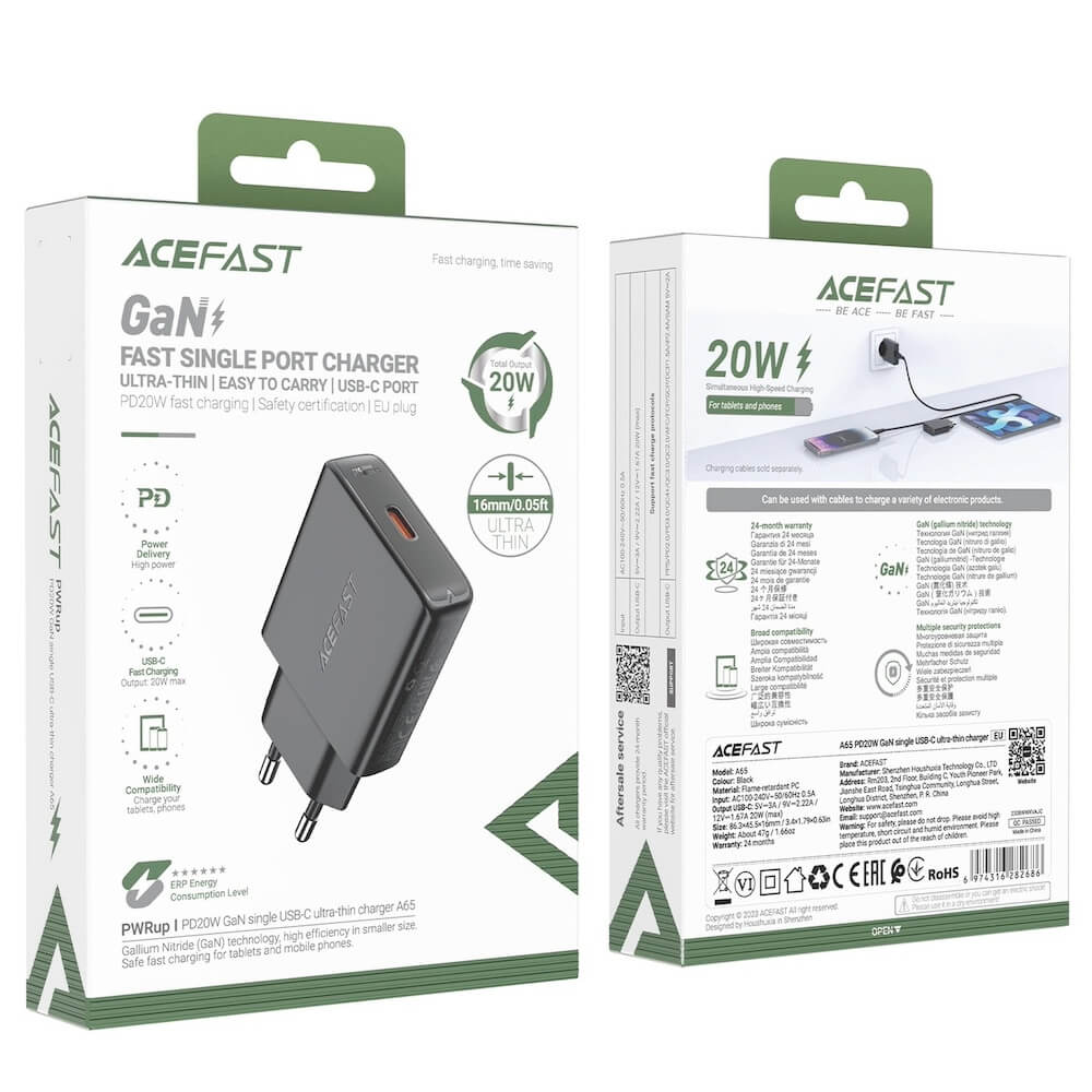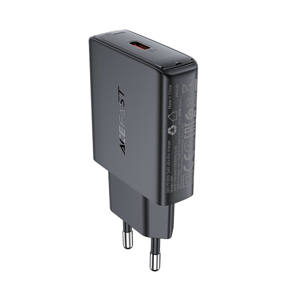 Acefast A65 PD GaN Fast Wall Charger 20W - захранване за ел. мрежа с USB-C изход с технология за бързо зареждане (черен)
