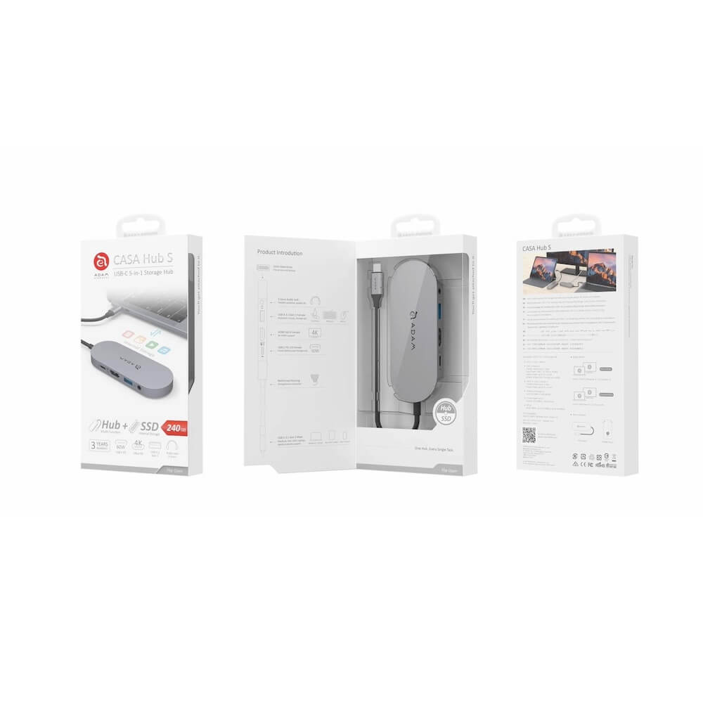 Adam Elements CASA USB-C 5-in-1 Hub with 240GB SSD - мултифункционален хъб за свързване на допълнителна периферия с вграден SSD диск за устройства с USB-C (тъмносив)