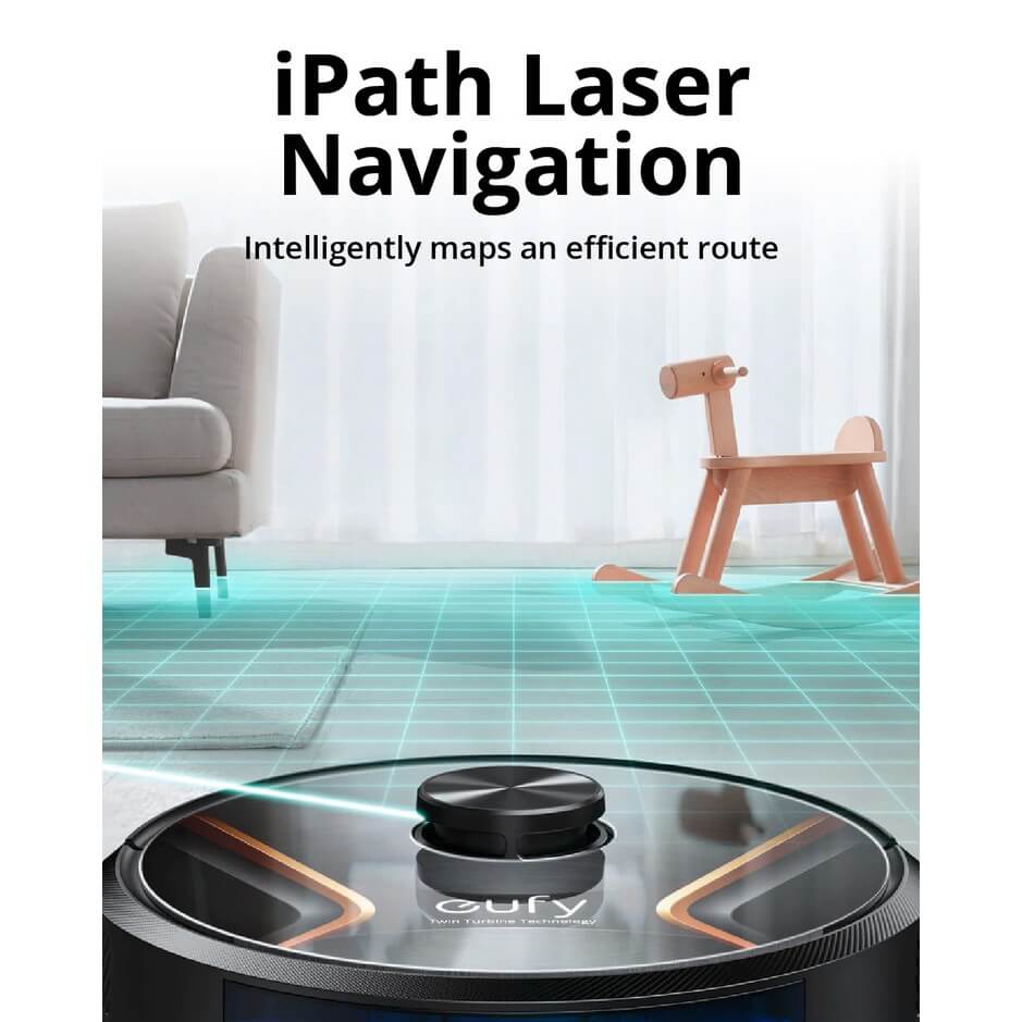 - iPath™ лазерна навигация: Чрез интелигентно запаметяване на вашата домашна среда, RoboVac може бързо да изгради виртуална карта, която да следва за най-ефективния маршрут за почистване, без да е необходимо да го картографирате ръчно