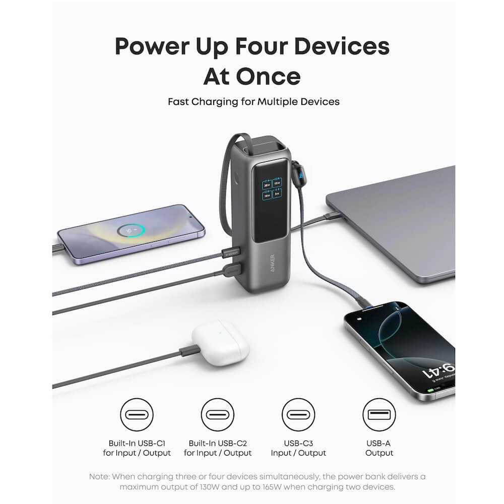 Anker Laptop Power Bank With Built-In Retractable Cables 25000 mAh 165W - външна батерия с вградени 2xUSB-C кабели и USB-C, USB-A портове и технология за бързо зареждане (черен)