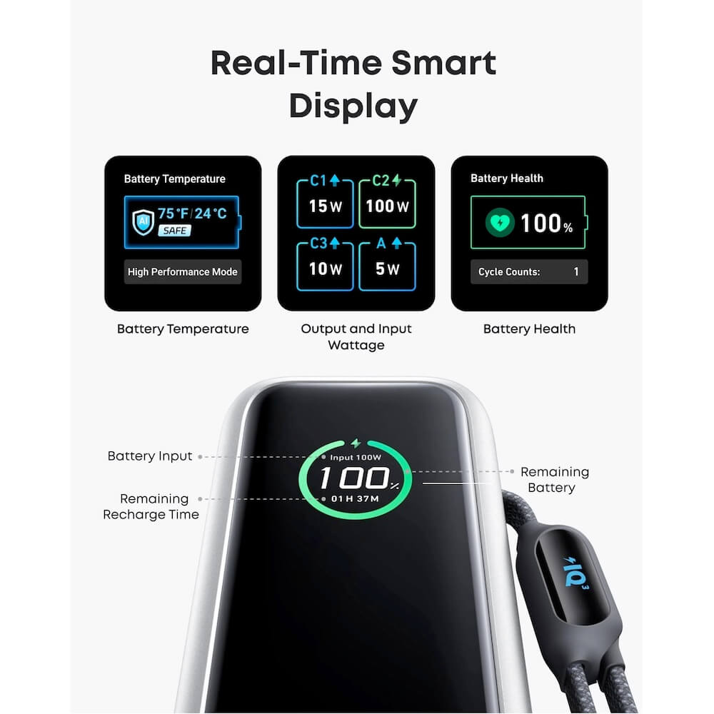 Открийте мощната външна батерия Anker Laptop Power Bank With Built-In Retractable Cables 25000 mAh 165W, която предлага надеждно и бързо зареждане за вашите устройства. С капацитет от 25 000mAh, тя е идеална за мобилни устройства и лаптопи като MacBook Pro 16.