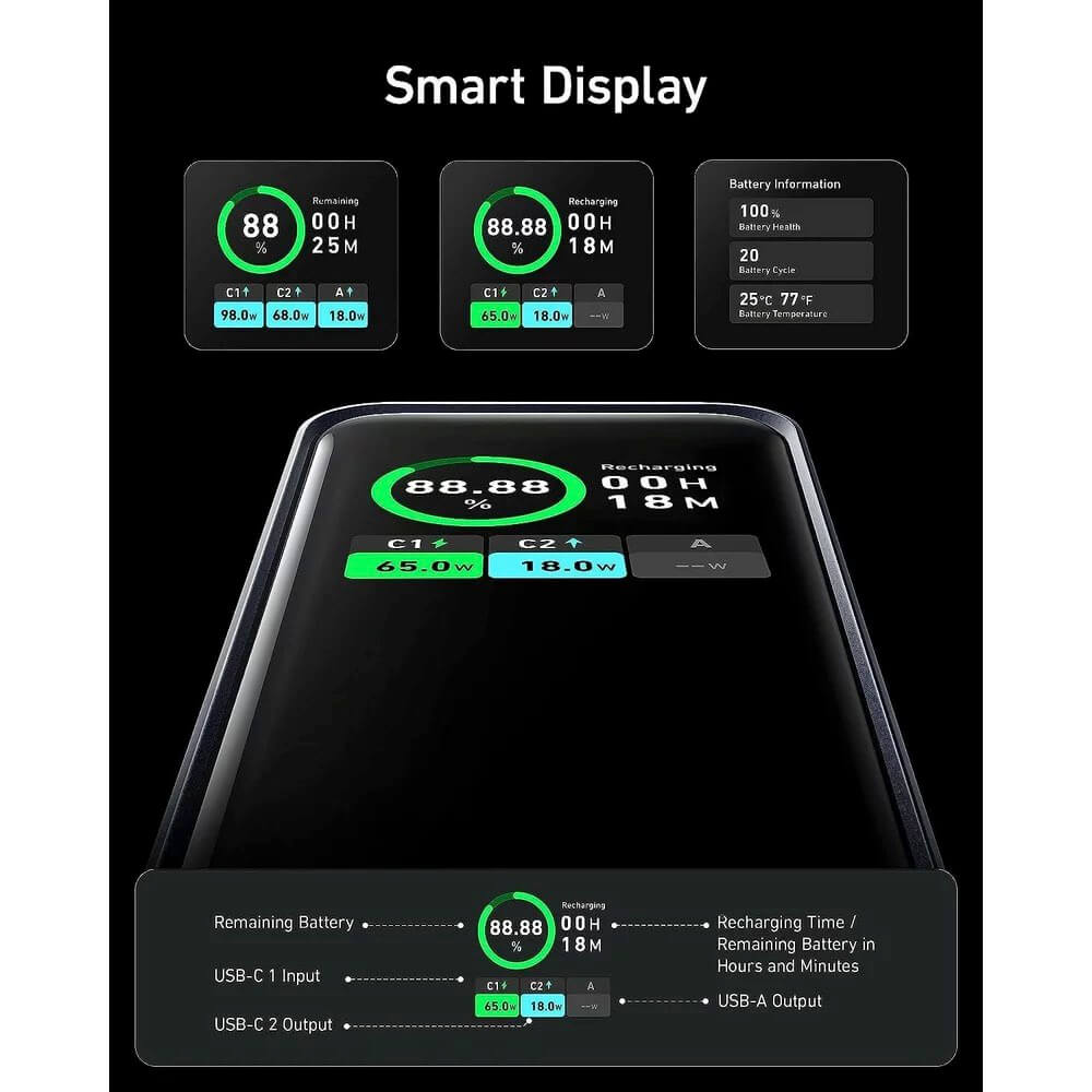 Батерията Anker Prime Power Bank е снабдена с PowerIQ 4.0 за по-висока ефективност и ActiveShield 2.0 за интелигентно наблюдение на температурата. Компактният и преносим дизайн я прави идеална за пътуване, лесно се побира в раница, чанта или джоб.