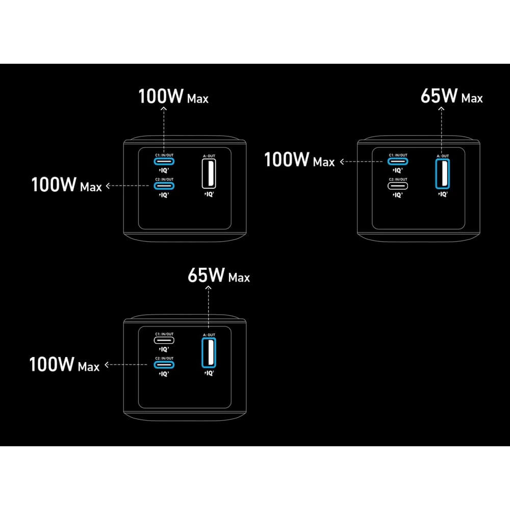 - Изходи: 2 x USB-C (100W Max), 1 x USB-A (65W Max)