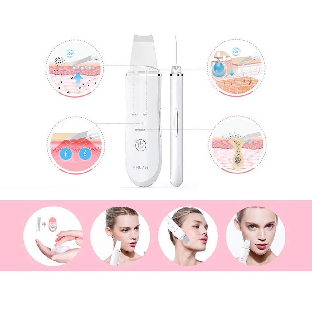 - Уредът за почистване на лице от Anlan използва ултразвук за отваряне на порите на лицето и дълбоко почистване на кожата. Това е практично пилинг устройство, което съчетава 3 много важни функции: ексфолиране, почистване и електрическа стимулация
