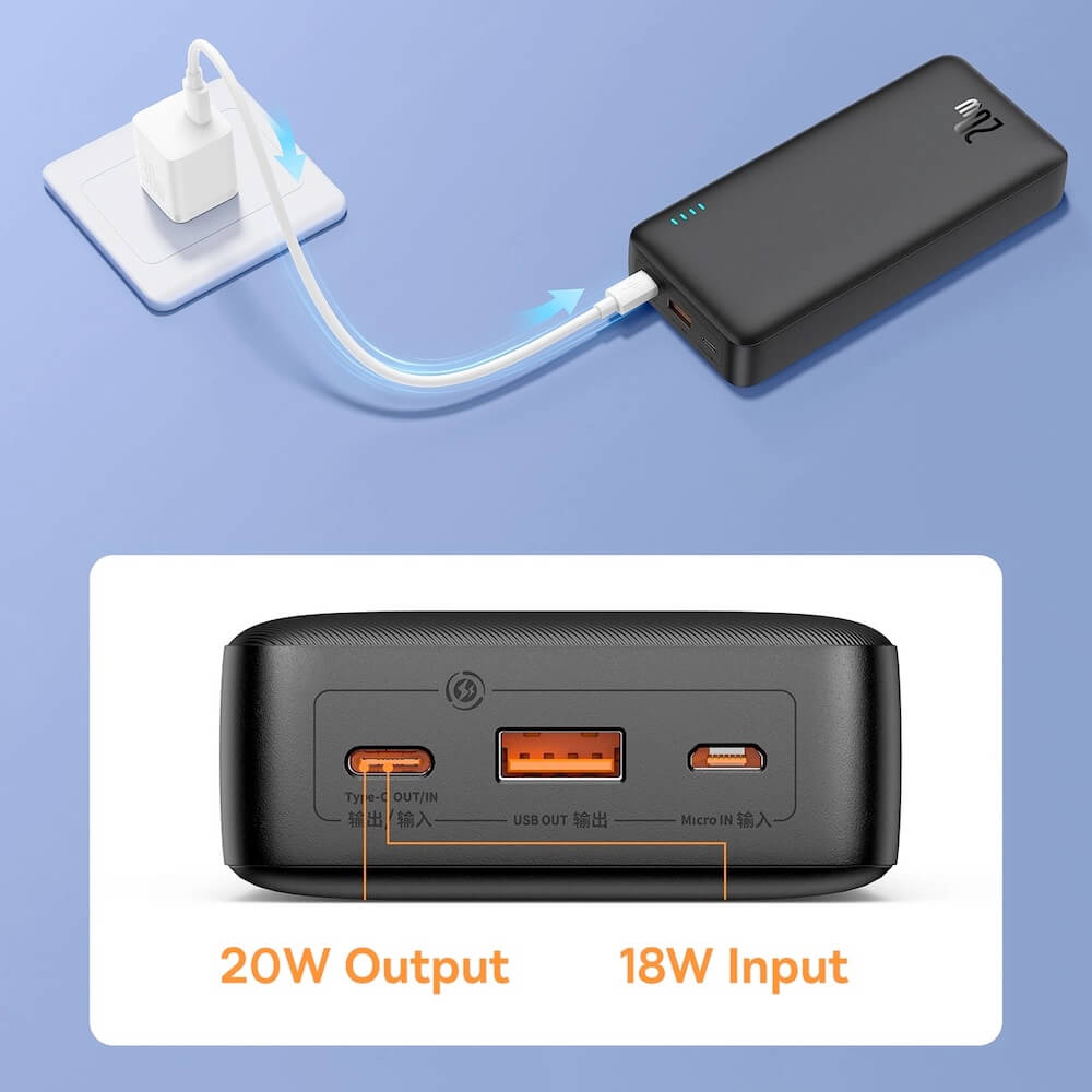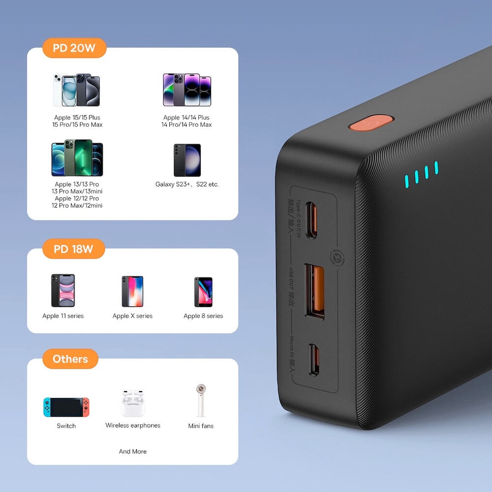 Благодарение на технологията PowerDelivery, вградена в USB-C порта, можете да зареждате съвместими устройства с до 20W мощност, което прави зареждането бързо и удобно. LED индикаторът показва текущото ниво на заряд, а вградените защити срещу презареждане и пренатоварване осигуряват безопасна употреба.