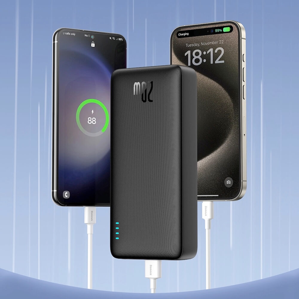 Baseus Airpow е изработен от качествен поликарбонат, което гарантира дълготрайна употреба и устойчивост на повреди. С два порта – USB-A и USB-C, можете да зареждате до три устройства едновременно, което я прави идеална за семейни пътувания или за споделяне с приятели.