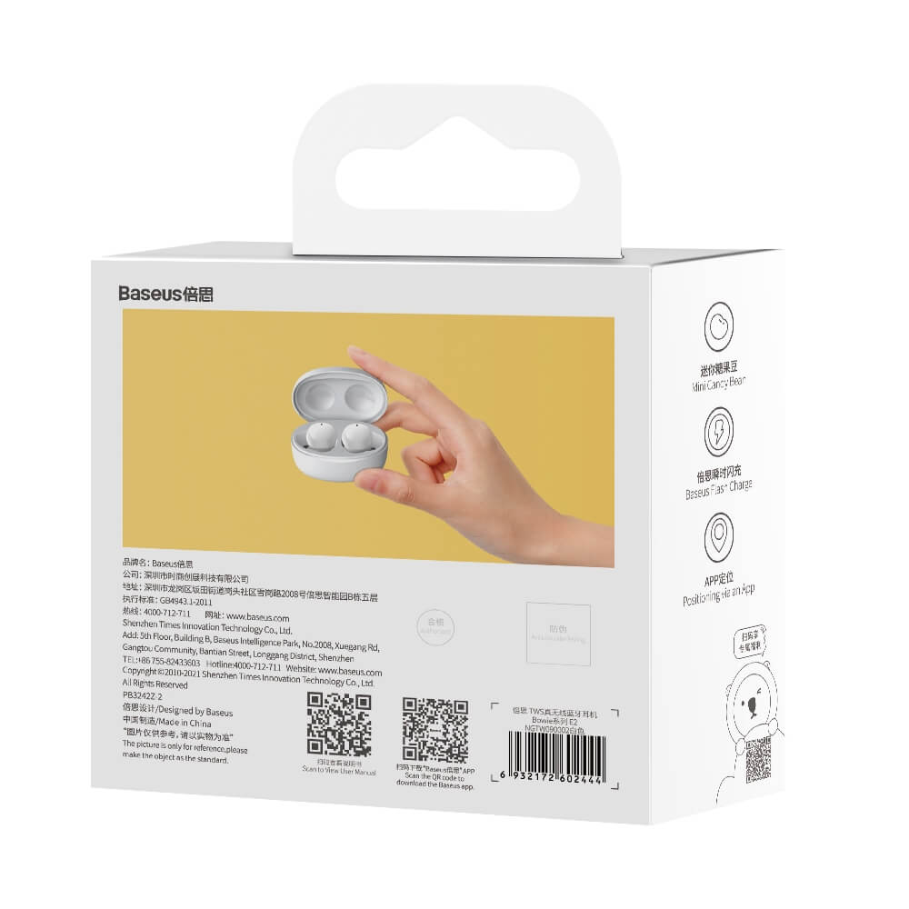 - 1 x Baseus Bowie E2 TWS In-Ear Bluetooth Earphones - 1 х Baseus кейс за зареждане и пренасяне на слушалките - 4 x Комплекта силиконови тапи с различни размери - 1 x USB-C кабел - 1 х ръководство