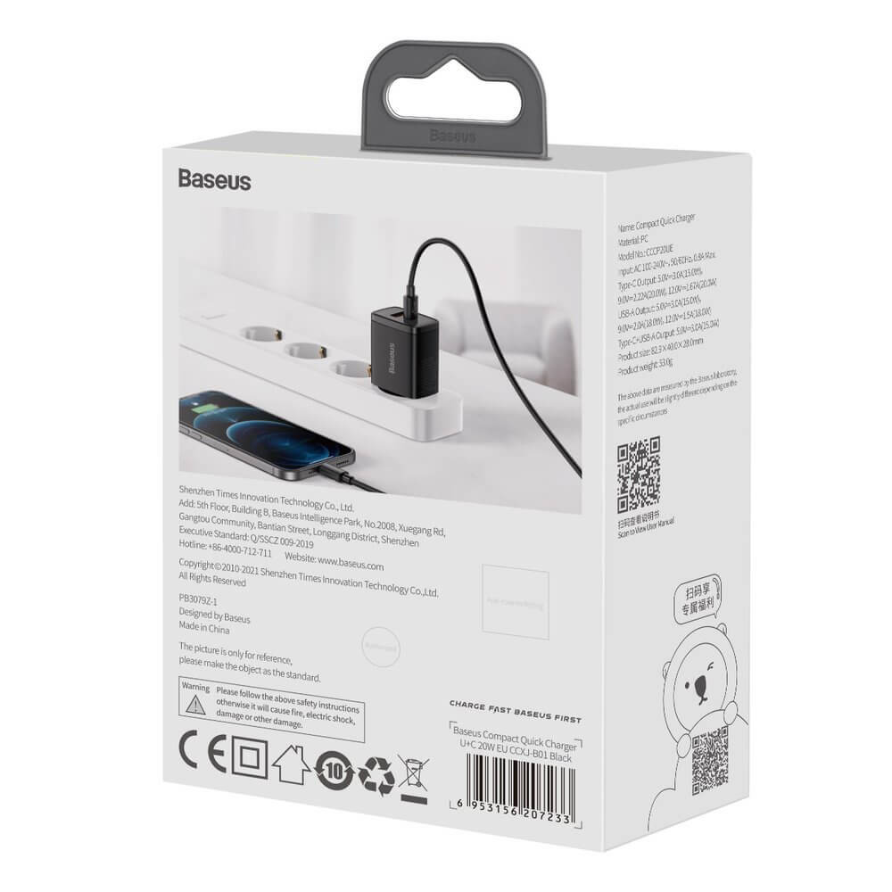 - 1 х Baseus Compact USB & USB-C QC 3.0 Wall Charger 20W