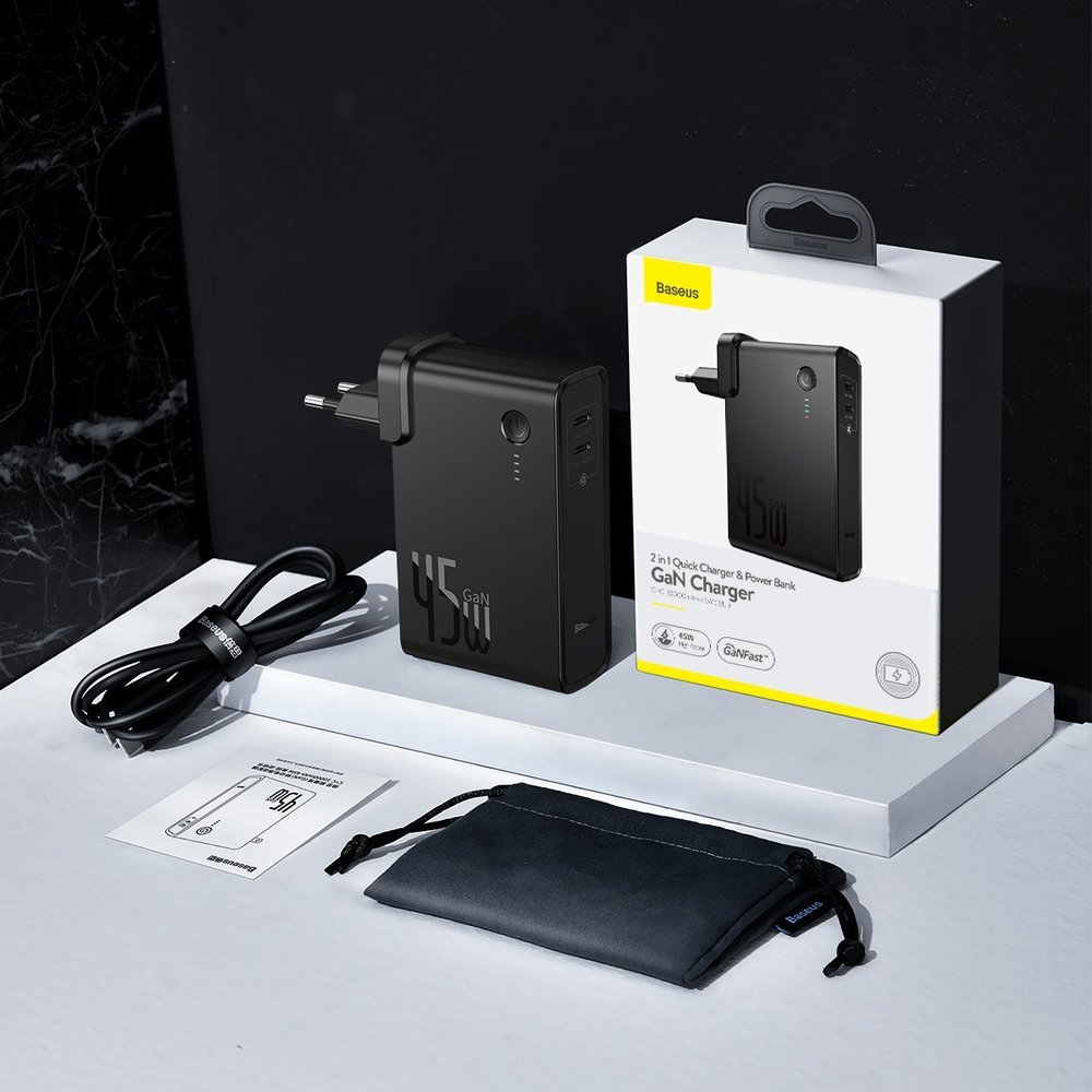 - 1 x Baseus GaN Charger 45W Power Bank - 1 x Baseus USB-C към USB-C кабел - 1 x калъфче - 1 x ръководство