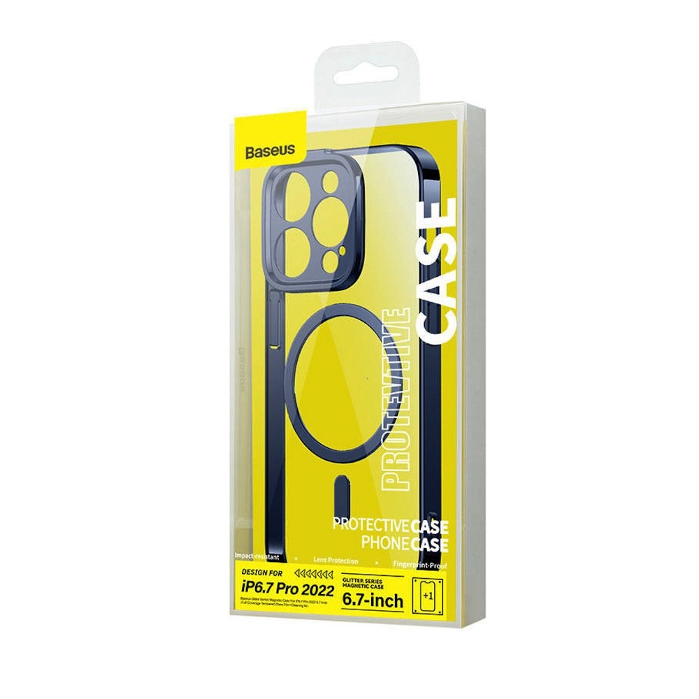 Baseus Glitter MagSafe Hybrid Protection Set - хибриден удароустойчив кейс с MagSafe и стъклено защитно покритие за дисплея на iPhone 14 Pro Max (син-прозрачен)