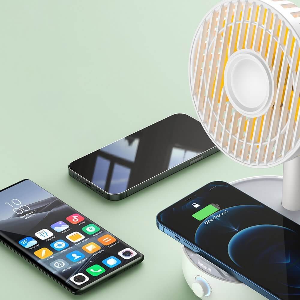 Baseus Hermit 2in1 Desktop Wireless Charger With Oscillating Fan - поставка (пад) за безжично зареждане (10W) и настолен вентилатор за Qi съвместими устройства (бял)
