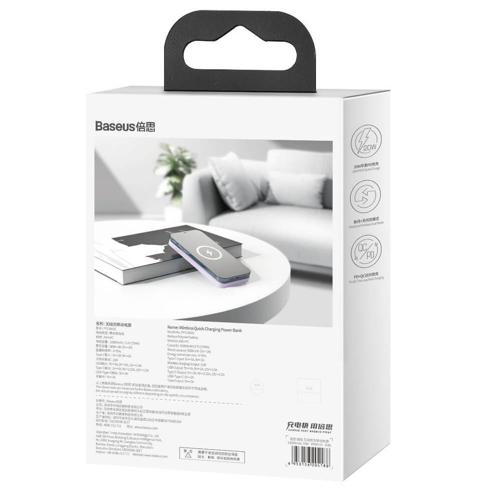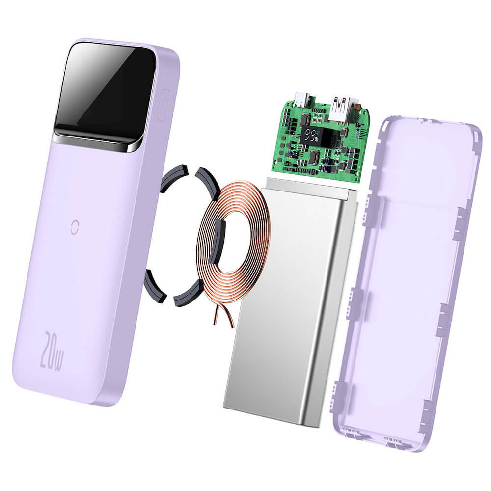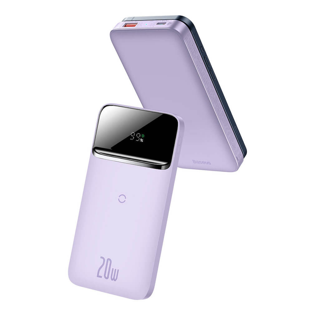 Baseus Magnetic Wireless Quick Charging Power Bank 10000 mAh (PPCX010005) - преносима външна батерия с USB-C порт, USB-A изход и безжично зареждане с MagSafe (лилав)