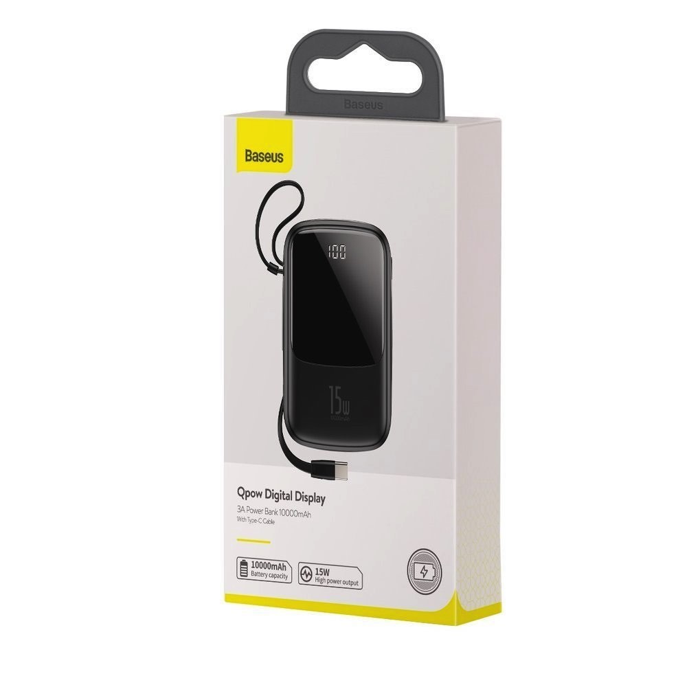 Baseus Qpow Digital Display Power bank with USB-C cable 15W (PPQD-A01) - външна батерия 10000 mAh с вграден USB-C кабел и USB-C, USB-A и Lightning портове (черен)