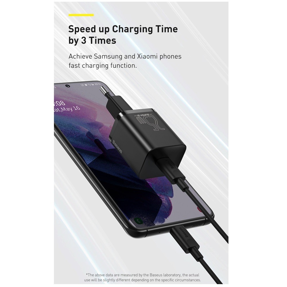 Baseus Super Si USB-C PD Wall Charger 25W (TZCCSUP-L01) - захранване за ел. мрежа с USB-C изход с технология за бързо зареждане и USB-C към USB-C кабел (черен)