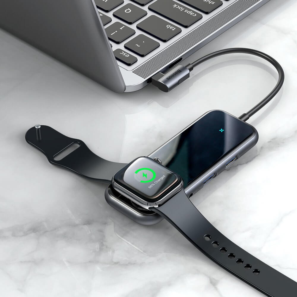 Baseus USB-C Mirror Series Hub CAHUB-AZ0G - мултифункционален хъб за свързване на допълнителна периферия за устройства с USB-C и зарядно за Apple Watch (тъмносив)