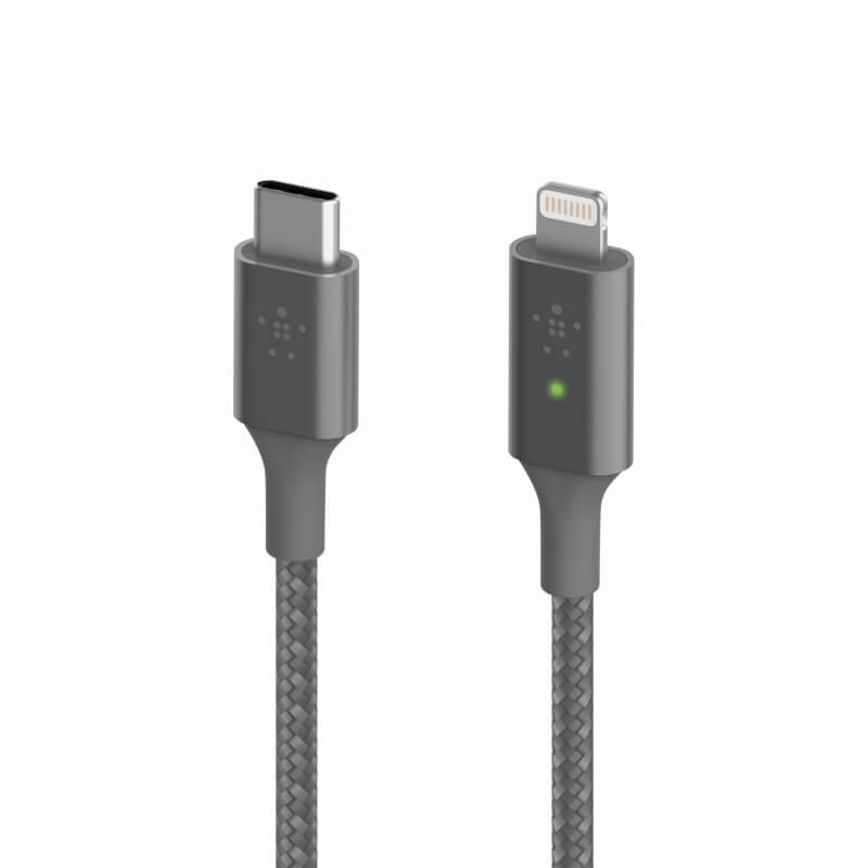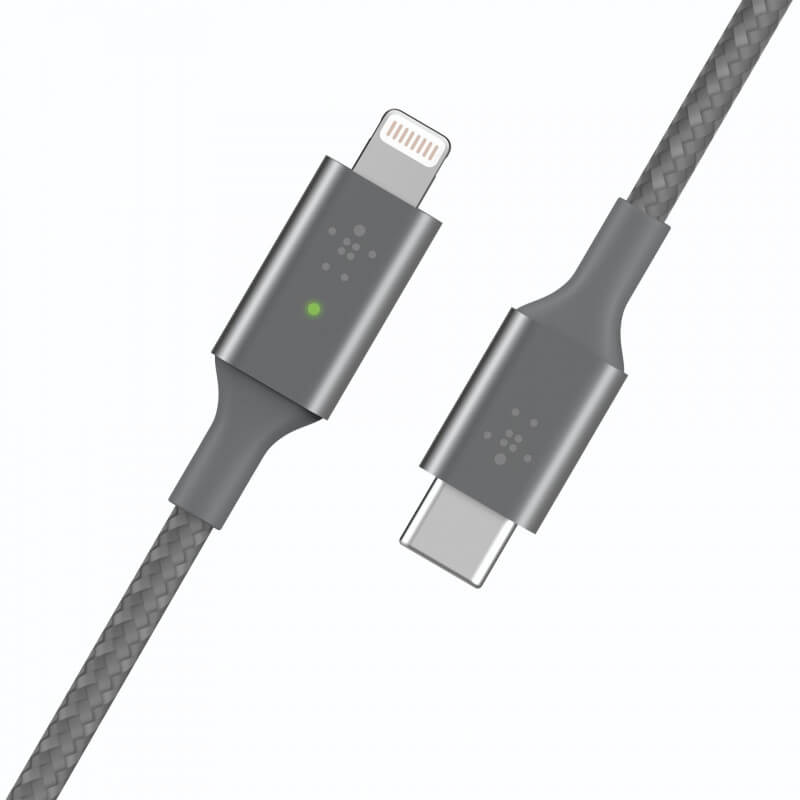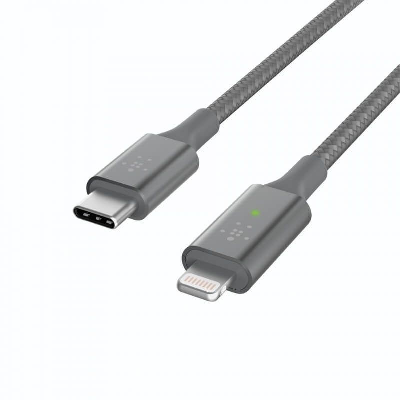 Belkin Boost Charge Smart LED USB-C to Lightning Cable - MFI сертифициран USB-C към Lightning кабел за Apple устройства с Lightning порт (120 см) (сив)