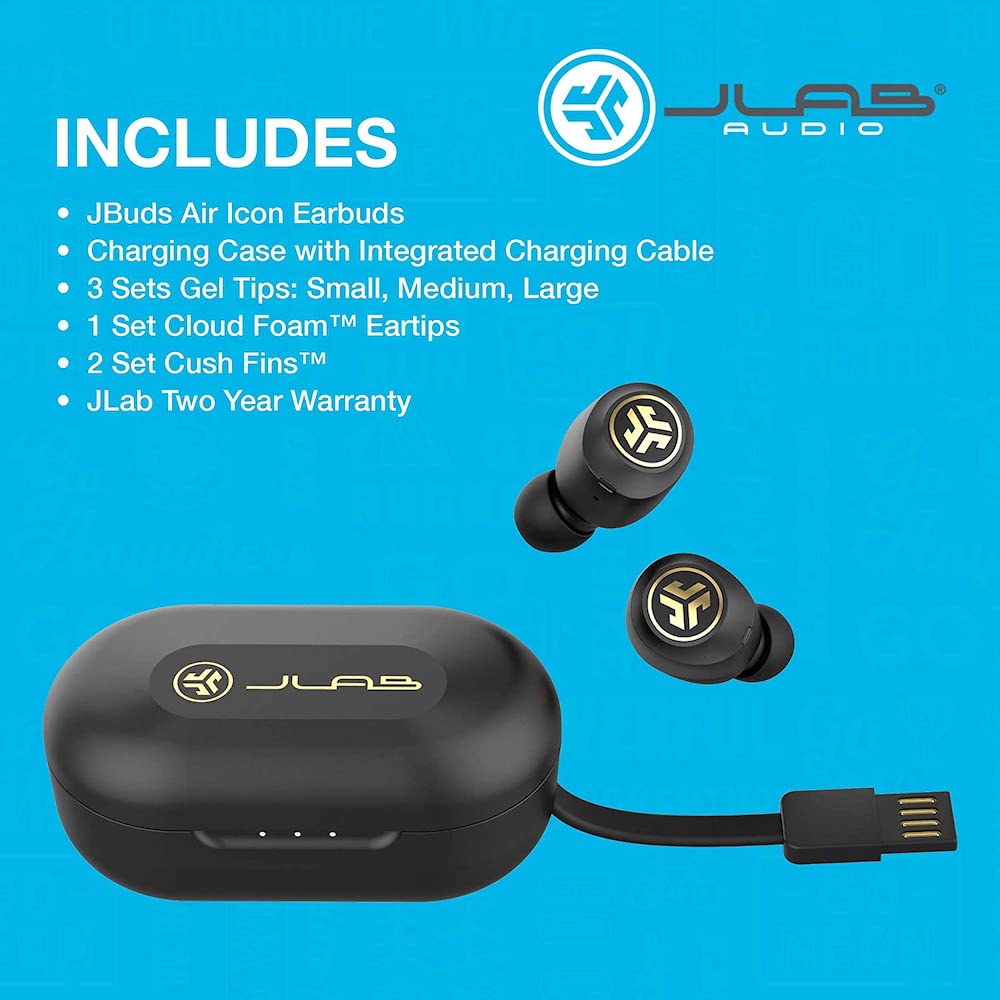 - В комплекта: 1 x JLAB JBuds Air Icon True Wireless TWS Earbuds, 1 x зареждащ кейс, 1 x чифт Cloud Foam™ уплътнение, 2 x чифта Cush Fins™ накрайници, 3 х чифта силиконови тапи (S/M/L)