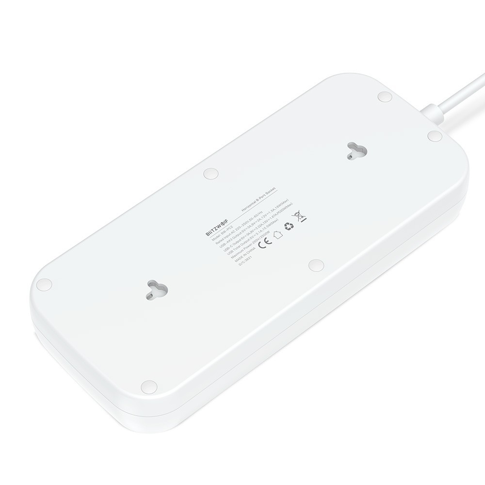 Blitzwolf 8 AC Outlets With USB-A and USB-C Ports Extension Power Strip 2500W - разклонител с 3xUSB-A и 1хUSB-C порта и 8хAC изхода (бял)