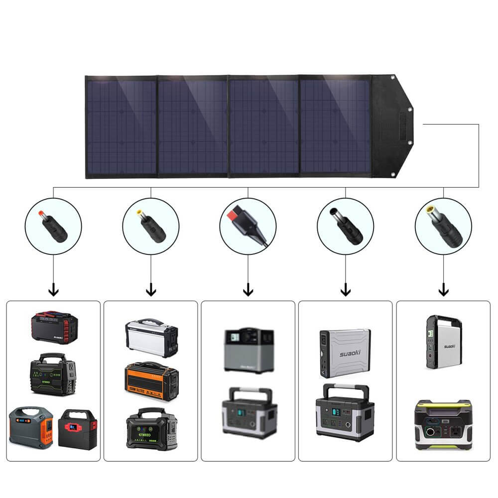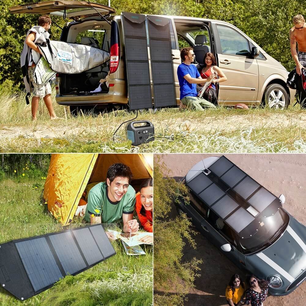 - Сгъаваем соларен панел с два USB-A, един USB-C и един DC порт, за зареждане на смартфон, таблети, лаптопи, камера или други USB устройства, директно от слънцето