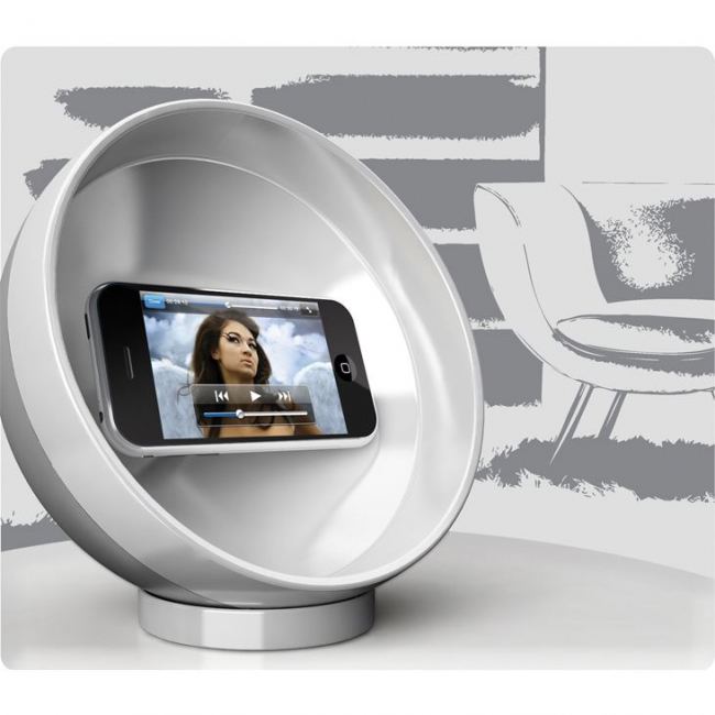• Сферата притежава прост, елегантен дизайн, който усилва звука с 10 децибела, спомагайки излъчването му във всяка стая. Параболичната форма е проектирана, с идеята за подсилено озвучаване, чрез продуциране на звука, но без нуждата от допълнителна мощност. Включен е и слот, през който вашият кабел преминава лесно, за да можете да синхронизирате и зареждате своето устройство, докато слушате любимите си парчета, или гледате видео в YouTube™