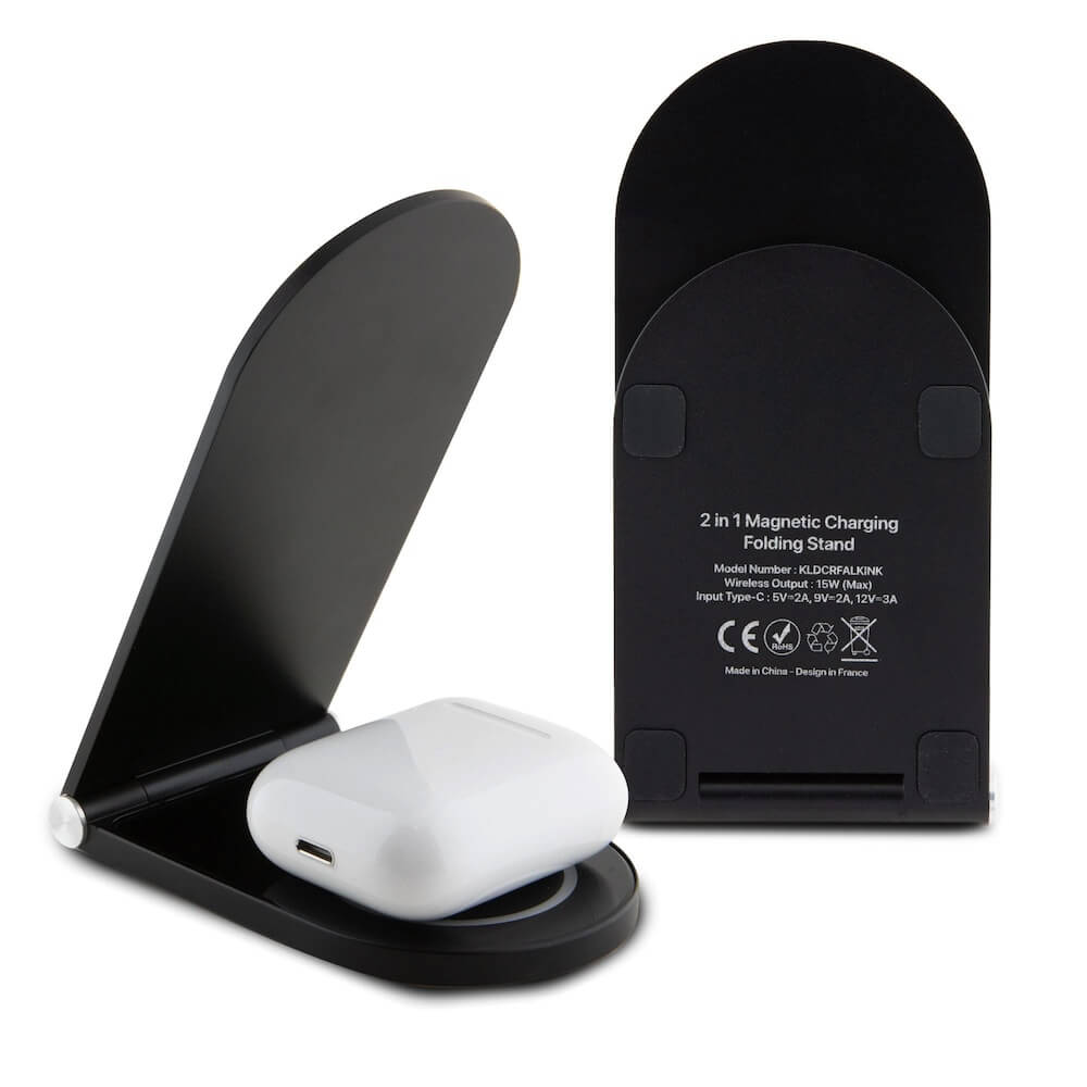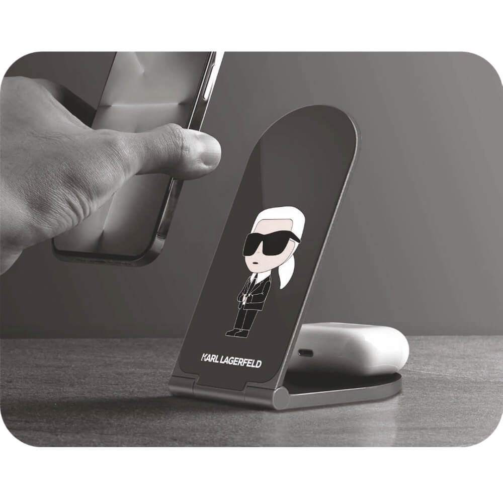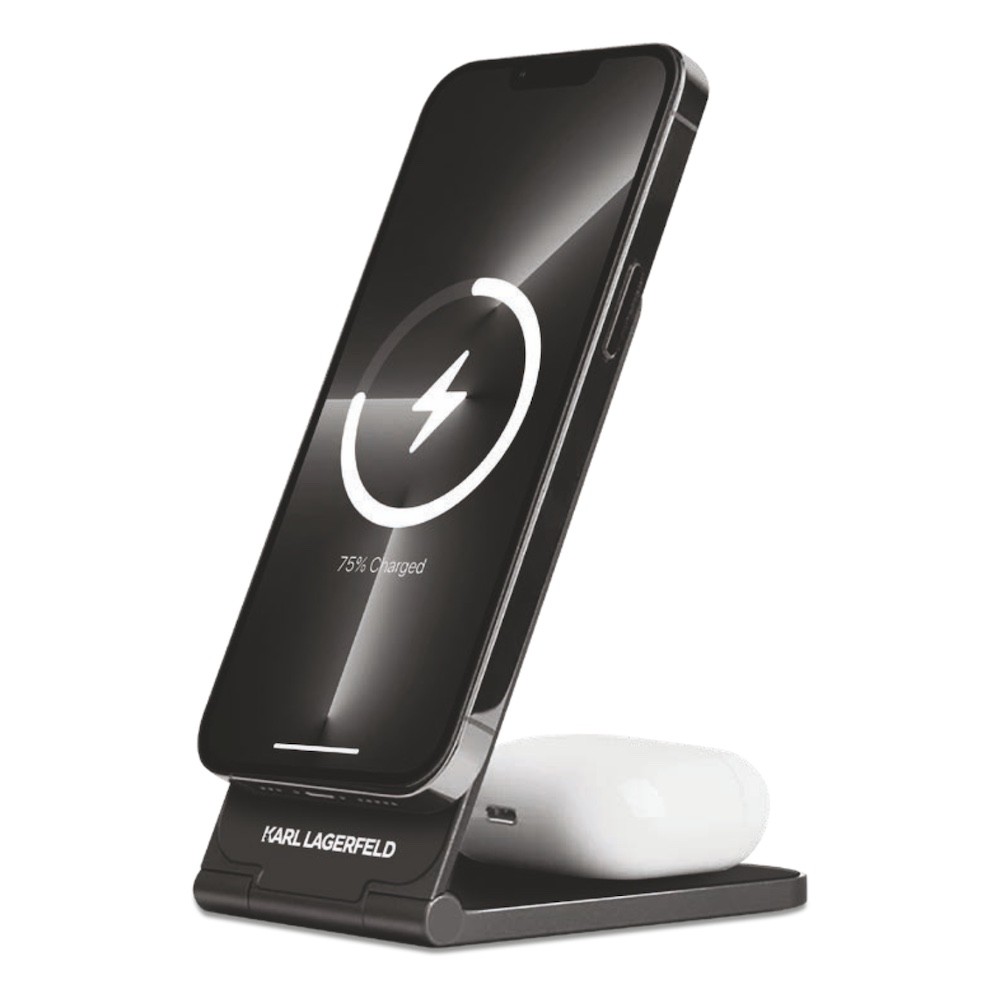 Дизайнерска двойна поставка (пад) за безжично зареждане за iPhone с Magsafe и Qi съвместими мобилни устройства - Karl Lagerfeld Ikonic NFT Aluminum Wireless Magsafe Charger 15W (черен)