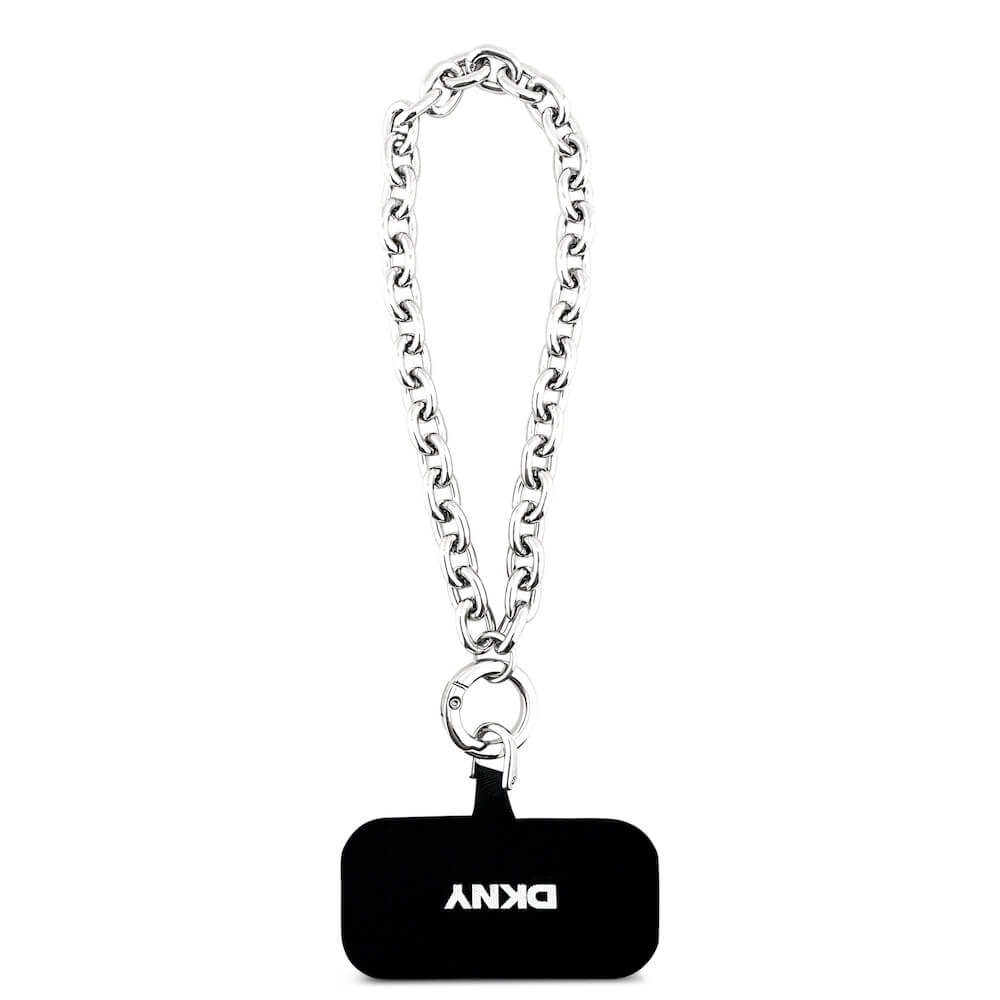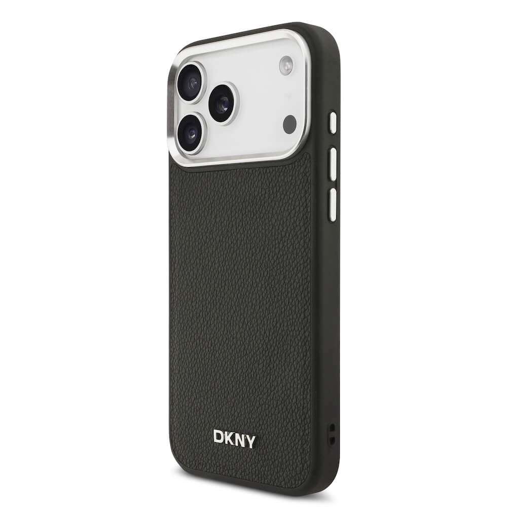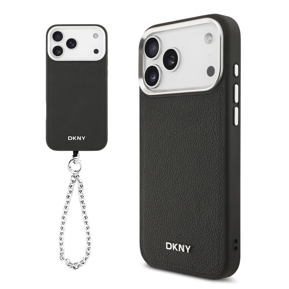 Дизайнерски кожен кейс с MagSafe и връзка за носене за iPhone 17 Pro Max - DKNY PU Leather Metal Logo Wrist Chain MagSafe Case (черен)