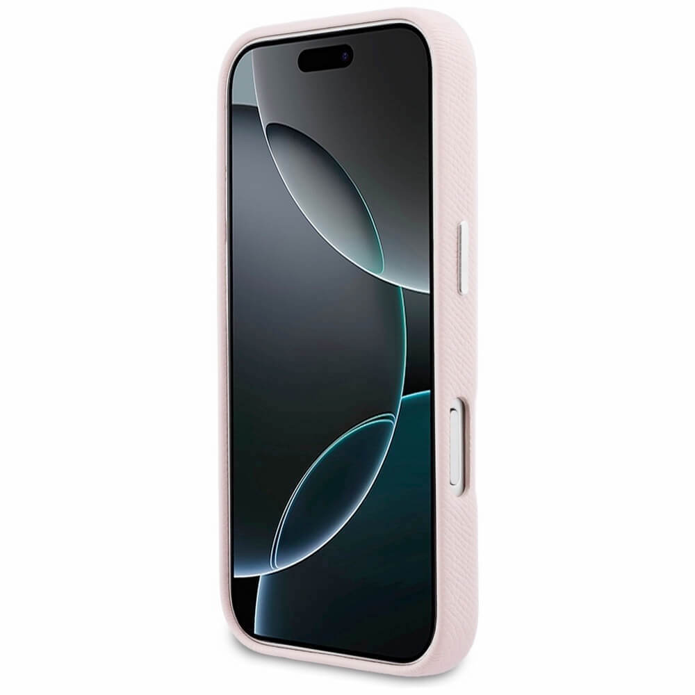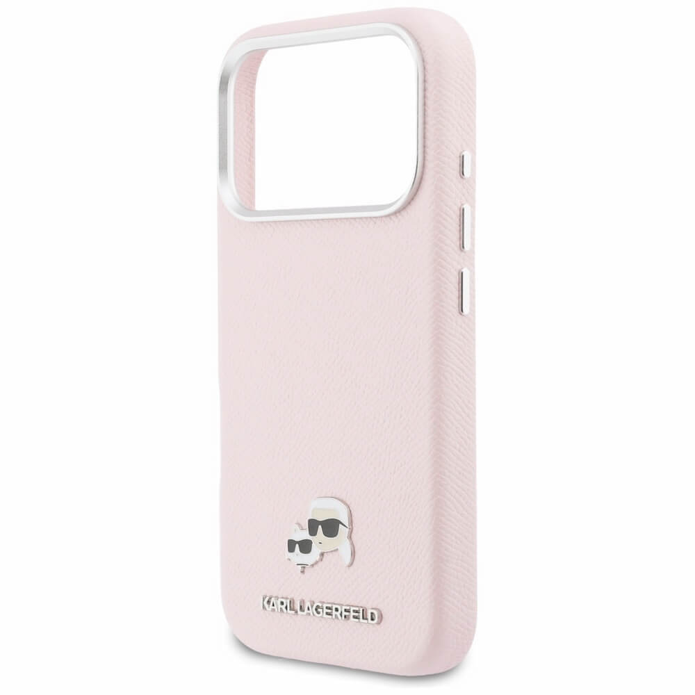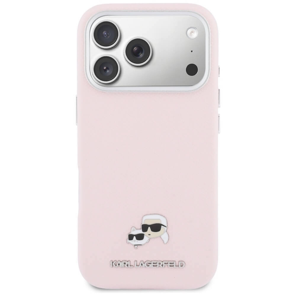 Дизайнерски кожен кейс с MagSafe за iPhone 17 Pro Max - Karl Lagerfeld PU Saffiano Karl and Choupette Heads Pins MagSafe Case (розов)