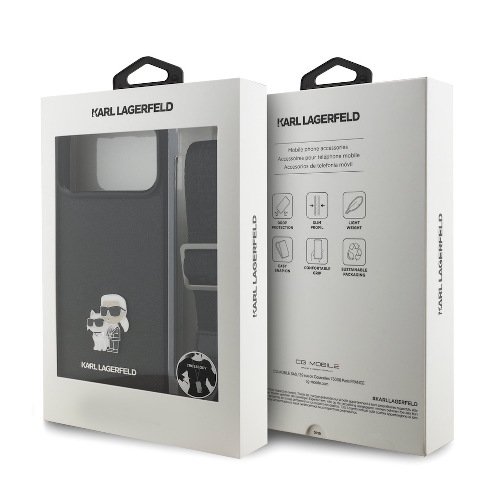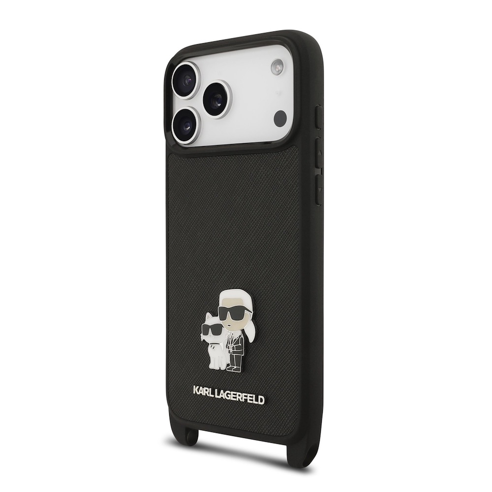 Дизайнерски кожен кейс с връзка за носене за iPhone 17 Prо Max - Karl Lagerfeld Saffiano Crossbody Metal Karl and Choupette Case (черен)