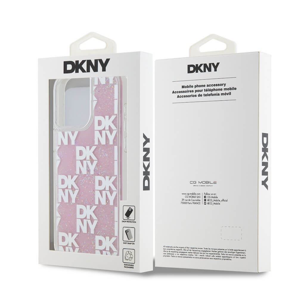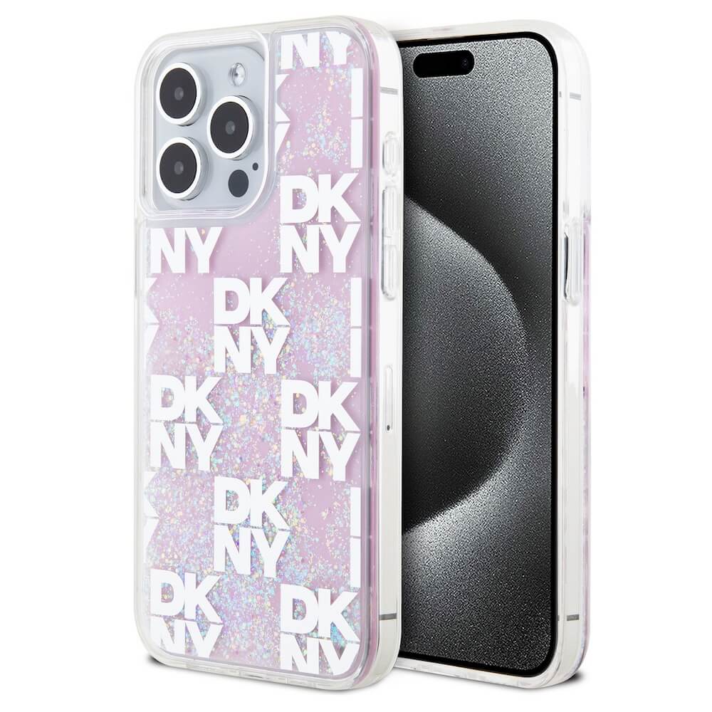 DKNY Liquid Glitter Checkered Pattern Case - дизайнерски кейс с висока защита за iPhone 15 Pro Max (розов)