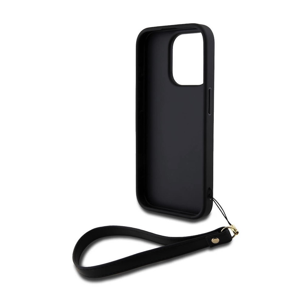 DKNY Stack Logo Wrist Strap Leather Hard Case - дизайнерски кожен кейс с връзка за носене за iPhone 15 Pro (черен)