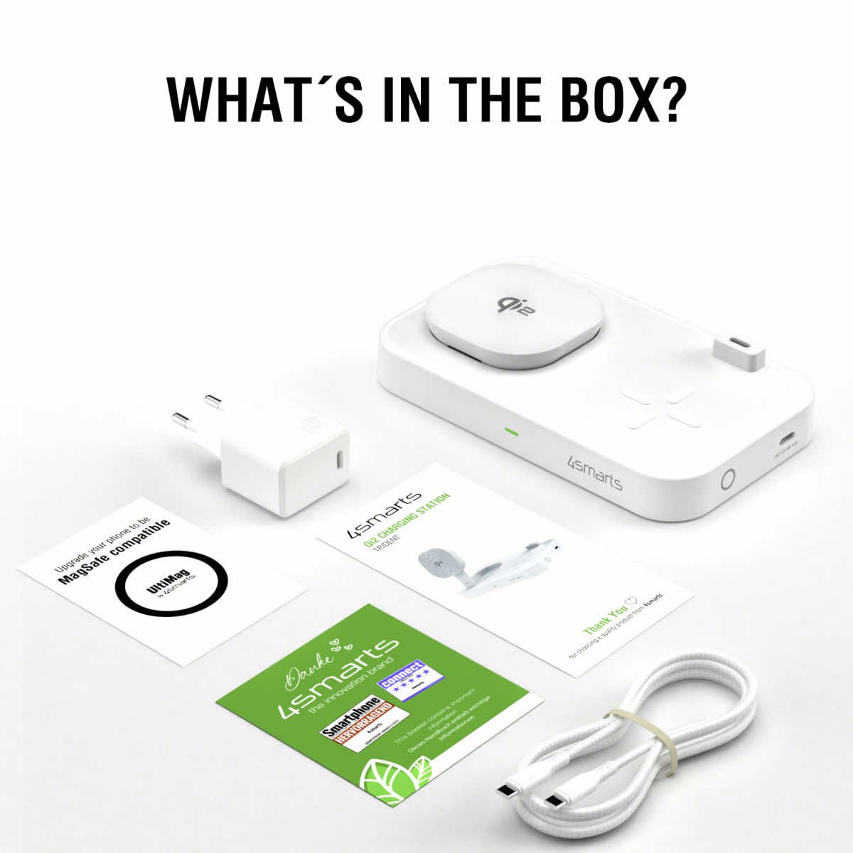 - В комплекта: - 1 x 4smarts Qi2 Charging Station Trident - 1 x 4smarts USB-C 30W захранване за ел. мрежа - 1 x 4smarts USB-C към USB-C кабел (150 см) - 1 x 4smarts UltiMag Ring (метален пръстен)
